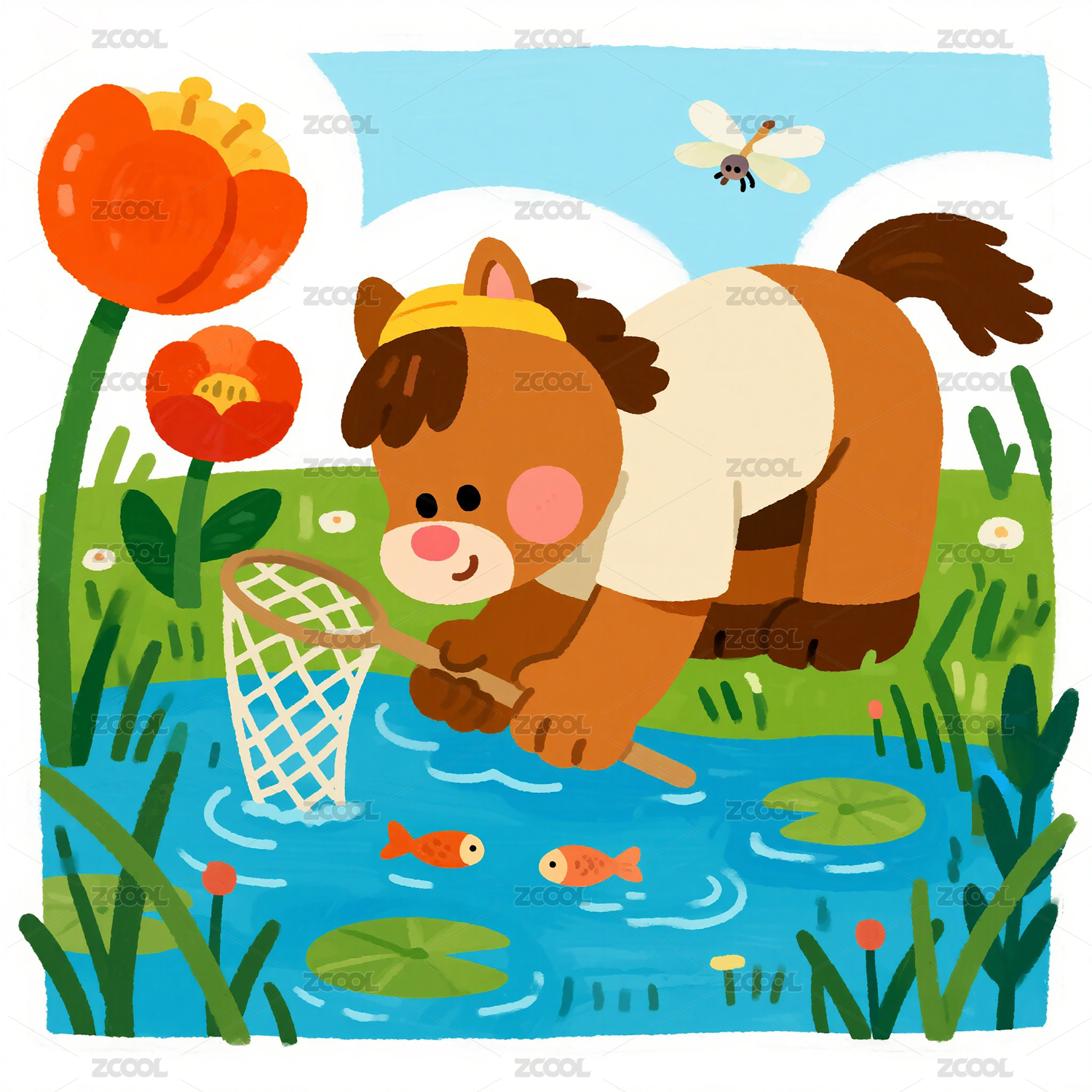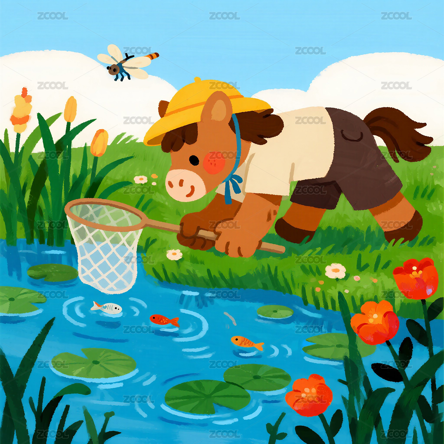 夏日池塘边小马捞鱼童趣插画