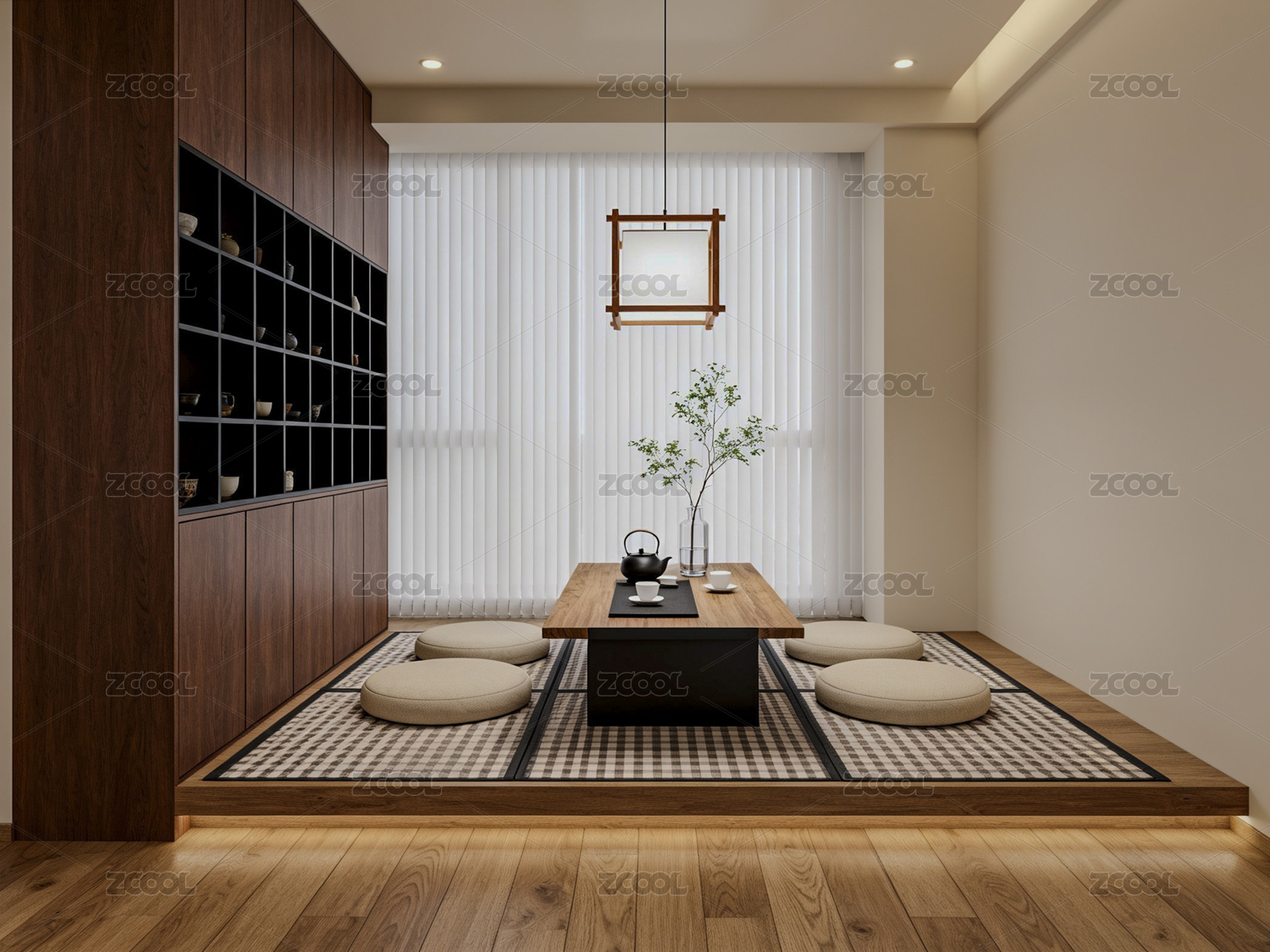 茶室,新中式,禅意,日式风格,茶桌,榻榻米,木质装修,简约,茶具,绿植