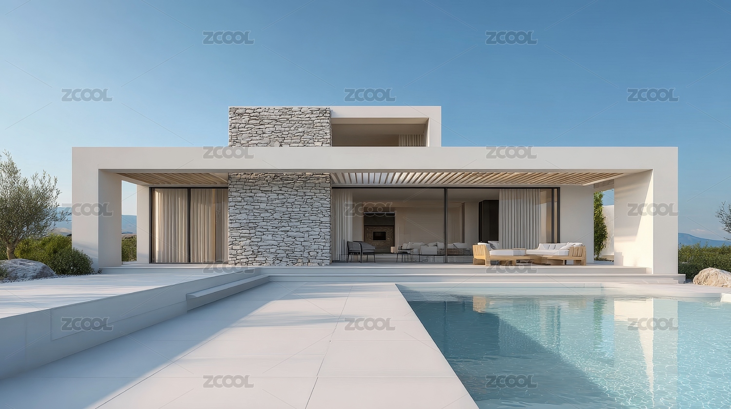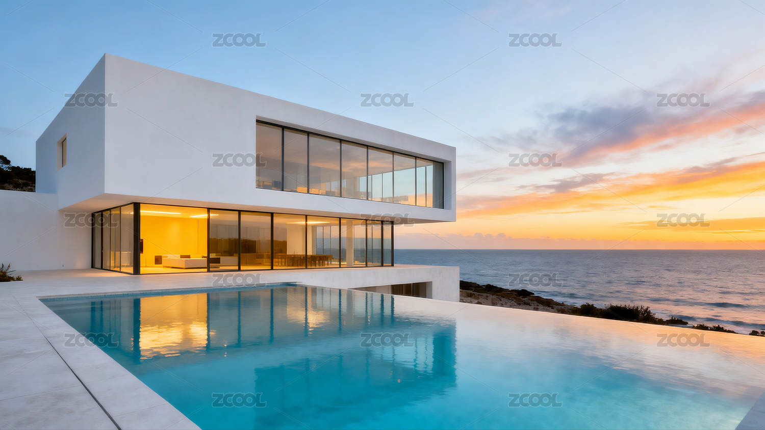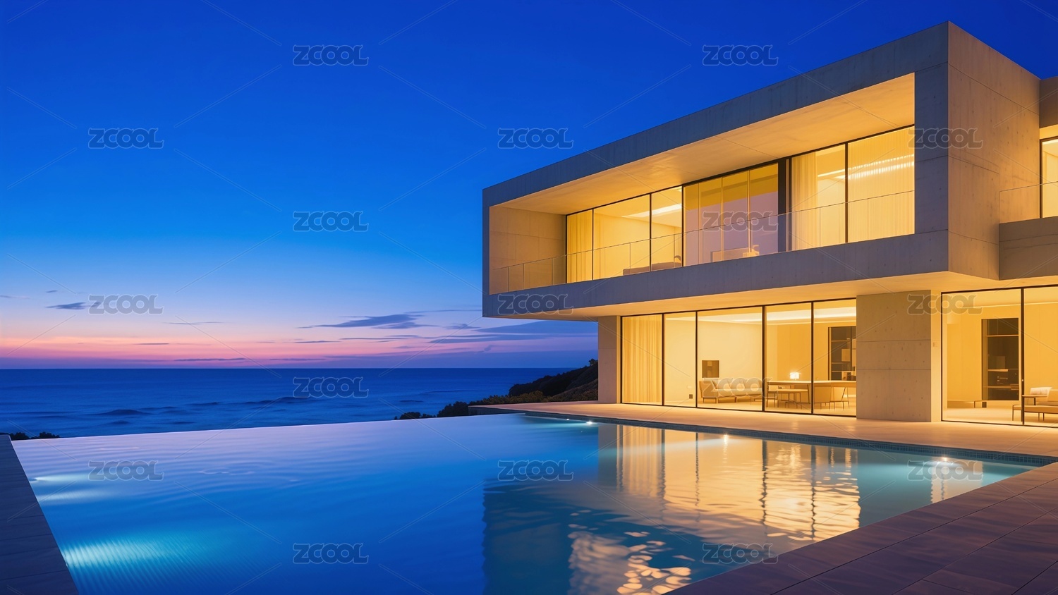 现代,别墅,豪宅,房屋,建筑,泳池,黄昏,自然,美景,简约