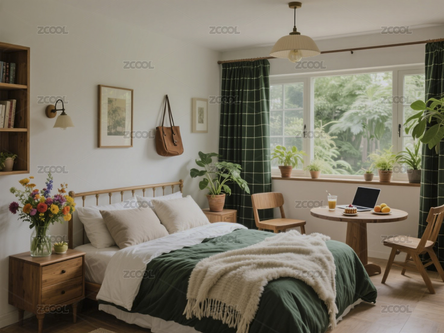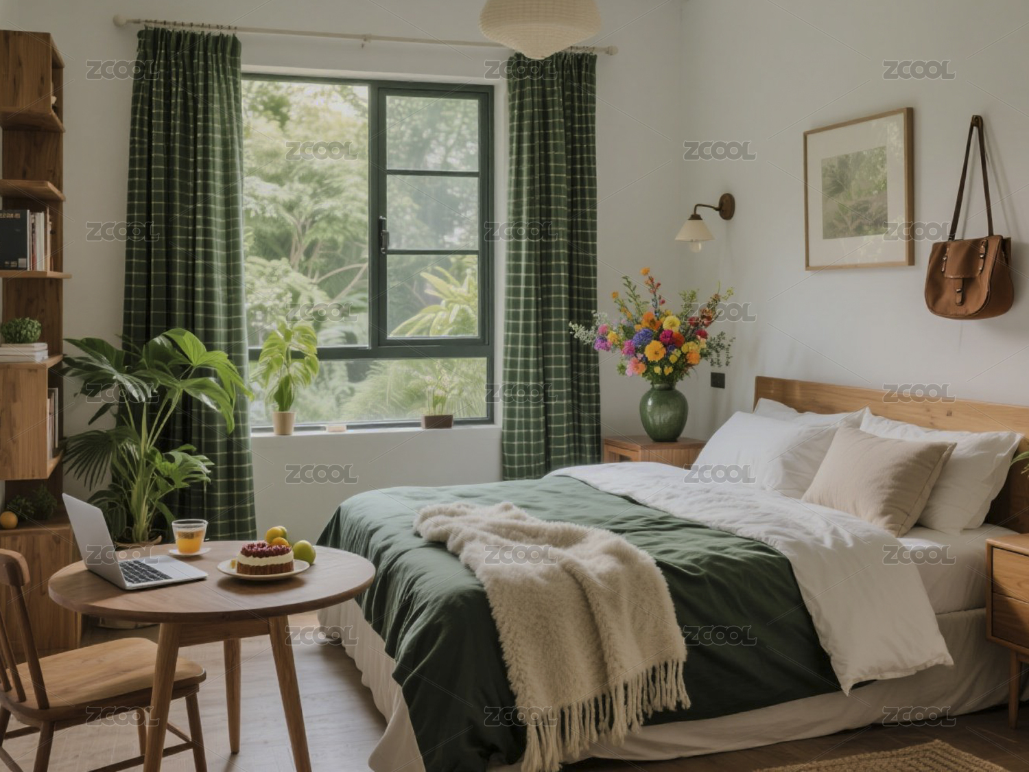 卧室,温馨,北欧风,居家,窗帘,窗户,绿植,花卉,木桌,床品