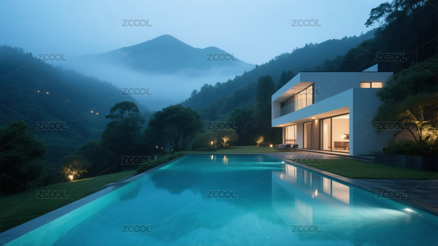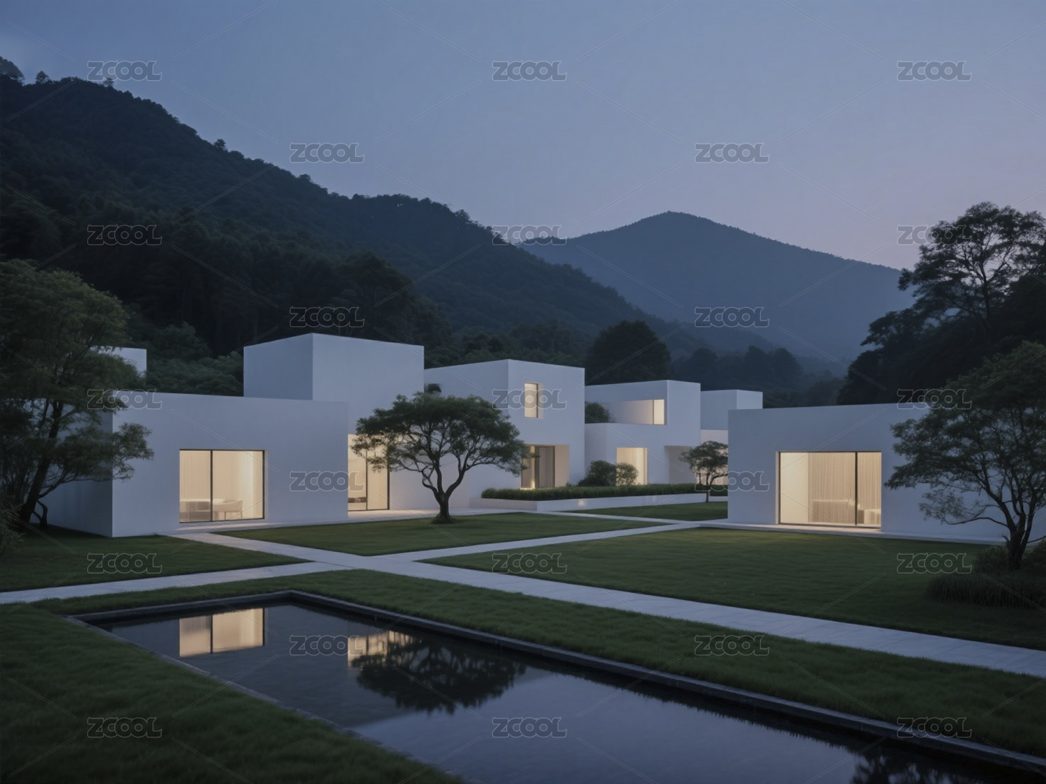 水景,夜景,极简风格,山景,草坪,倒影,别墅,现代,白色,庭院