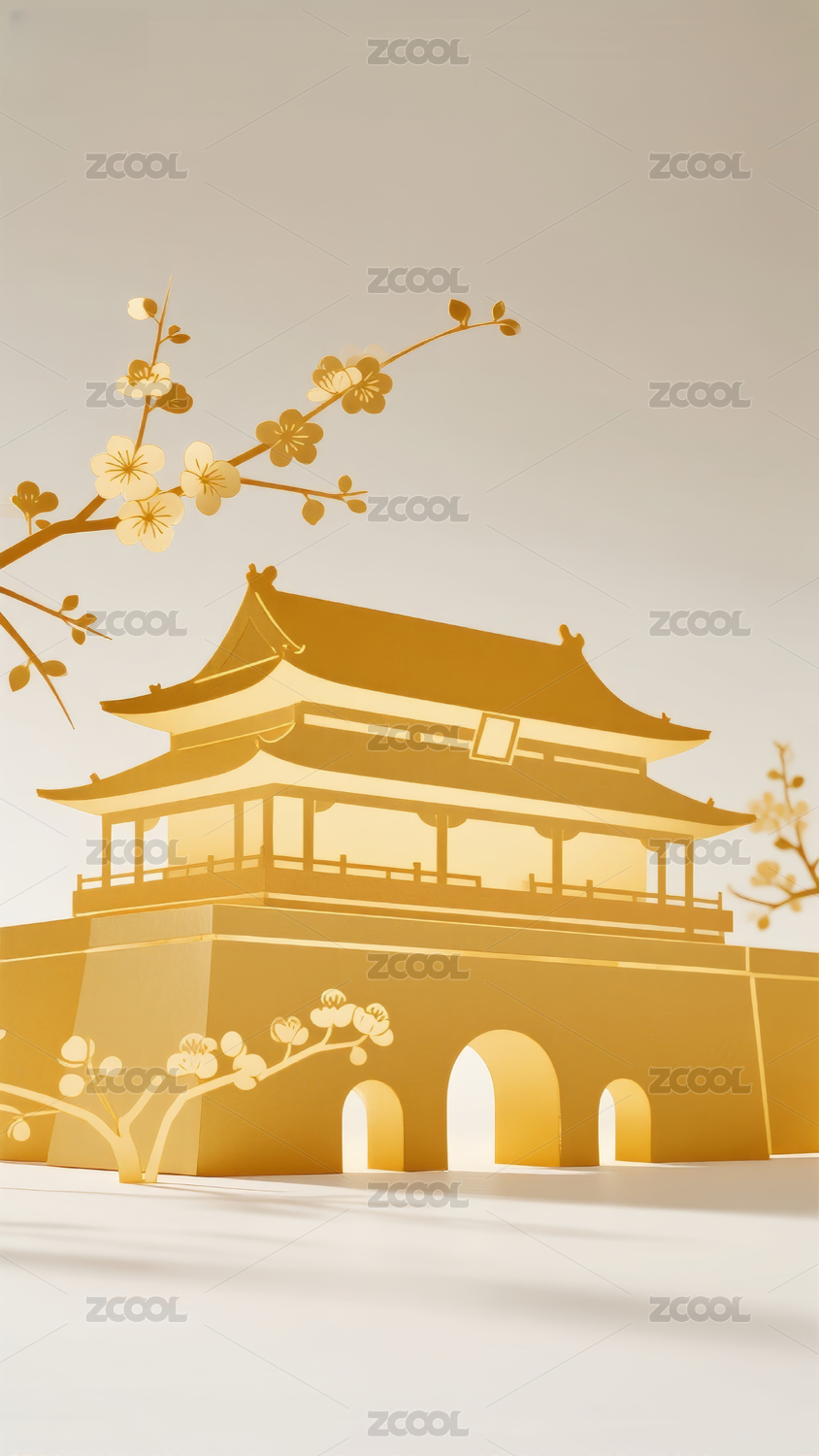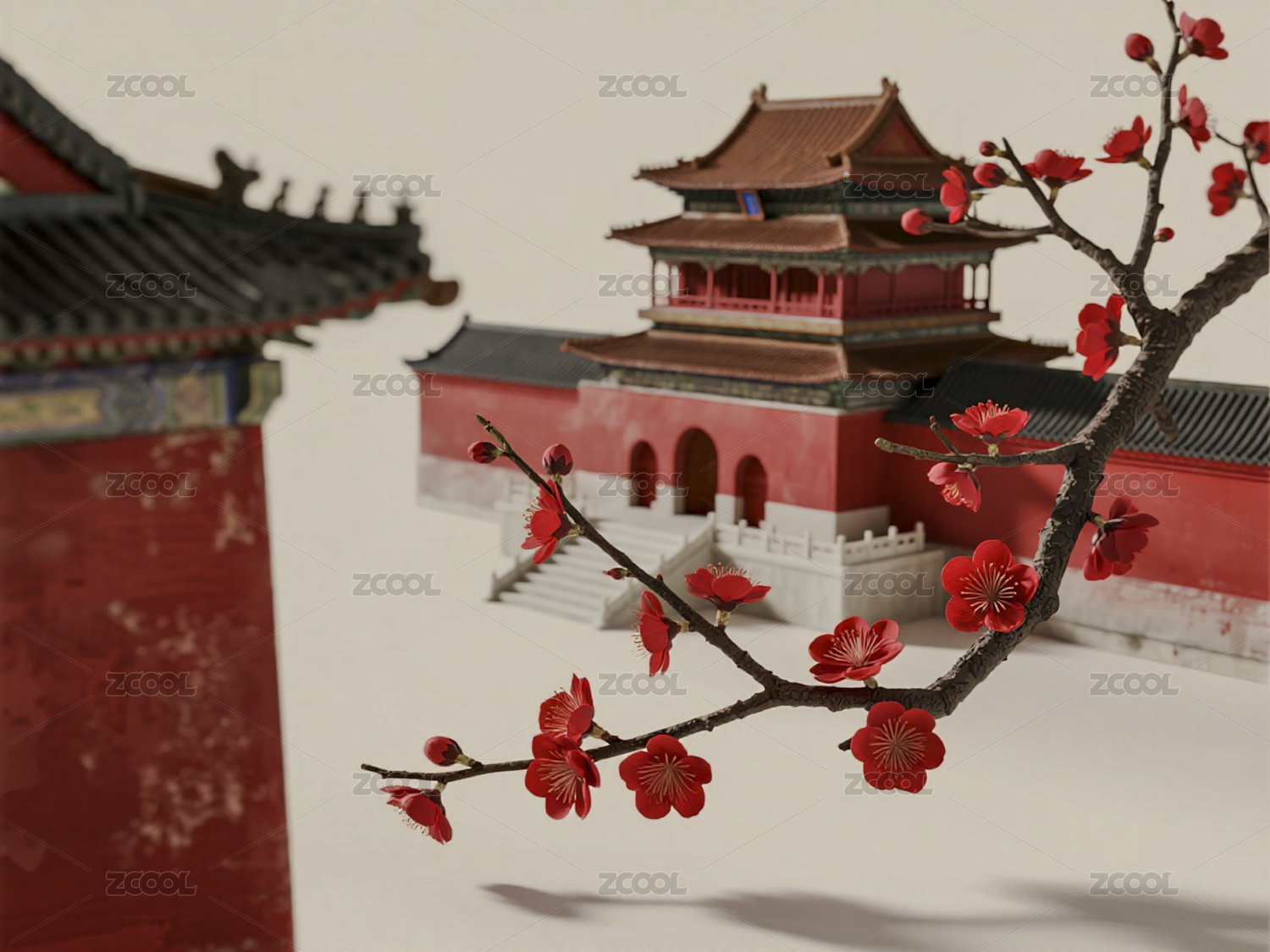 红梅,梅花,古建筑,宫墙,传统建筑,国风,古风,绘画,阁楼,楼阁