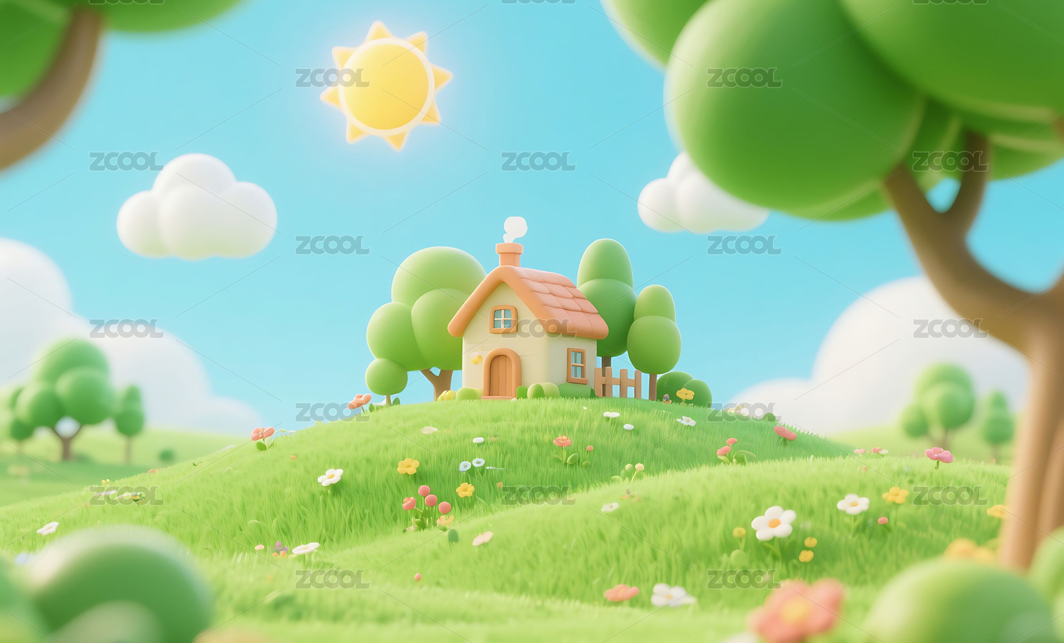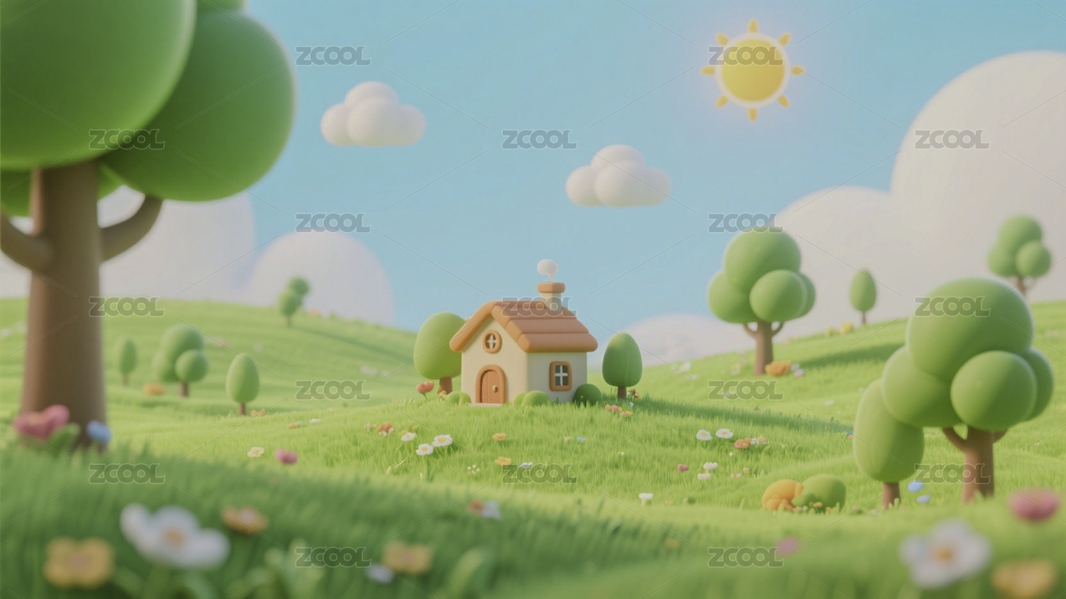 阳光草原上的卡通小屋风景