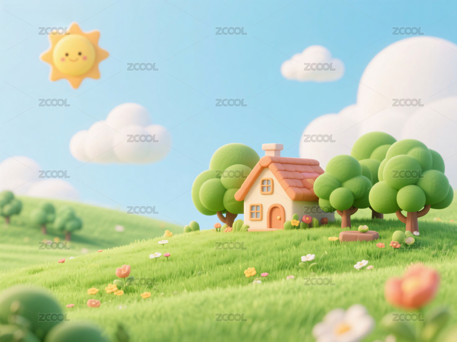 3D清新卡通风格草地上的房屋插画