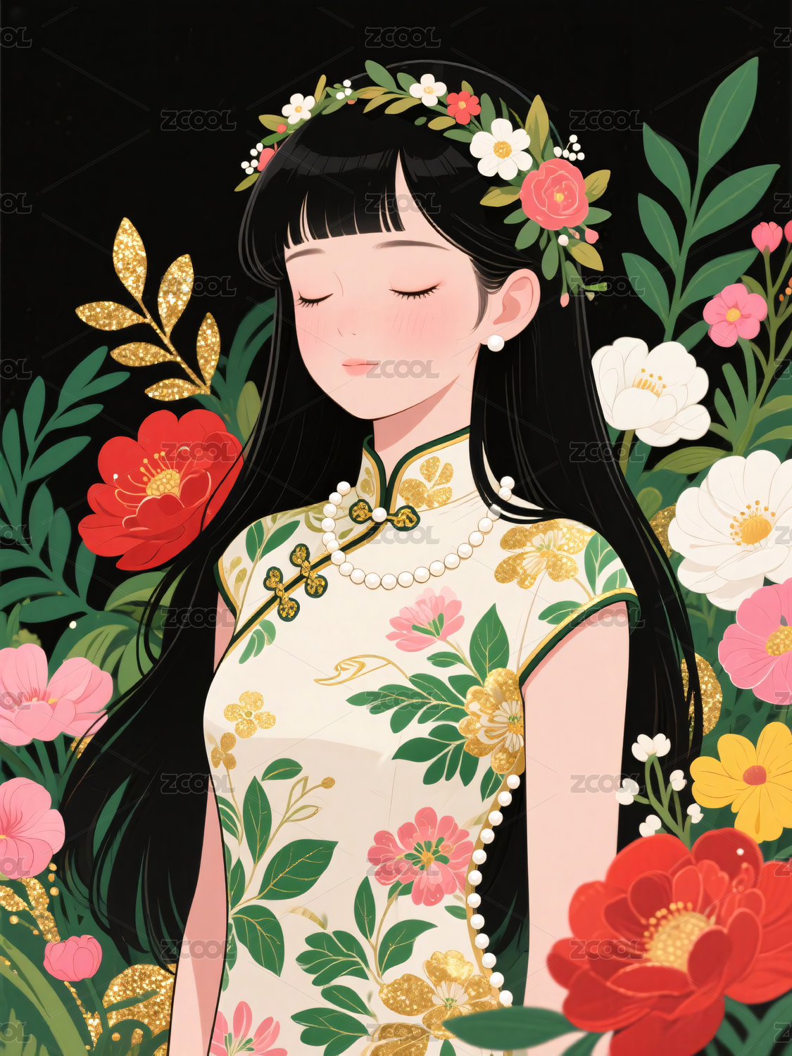 旗袍,少女,繁花,插画,国风,黑色,金色,花纹,花环,长发
