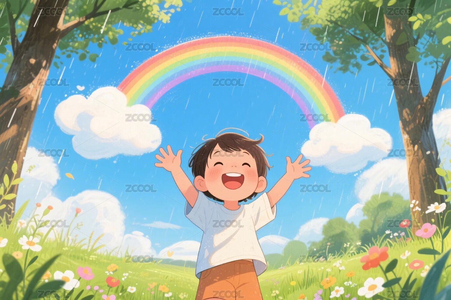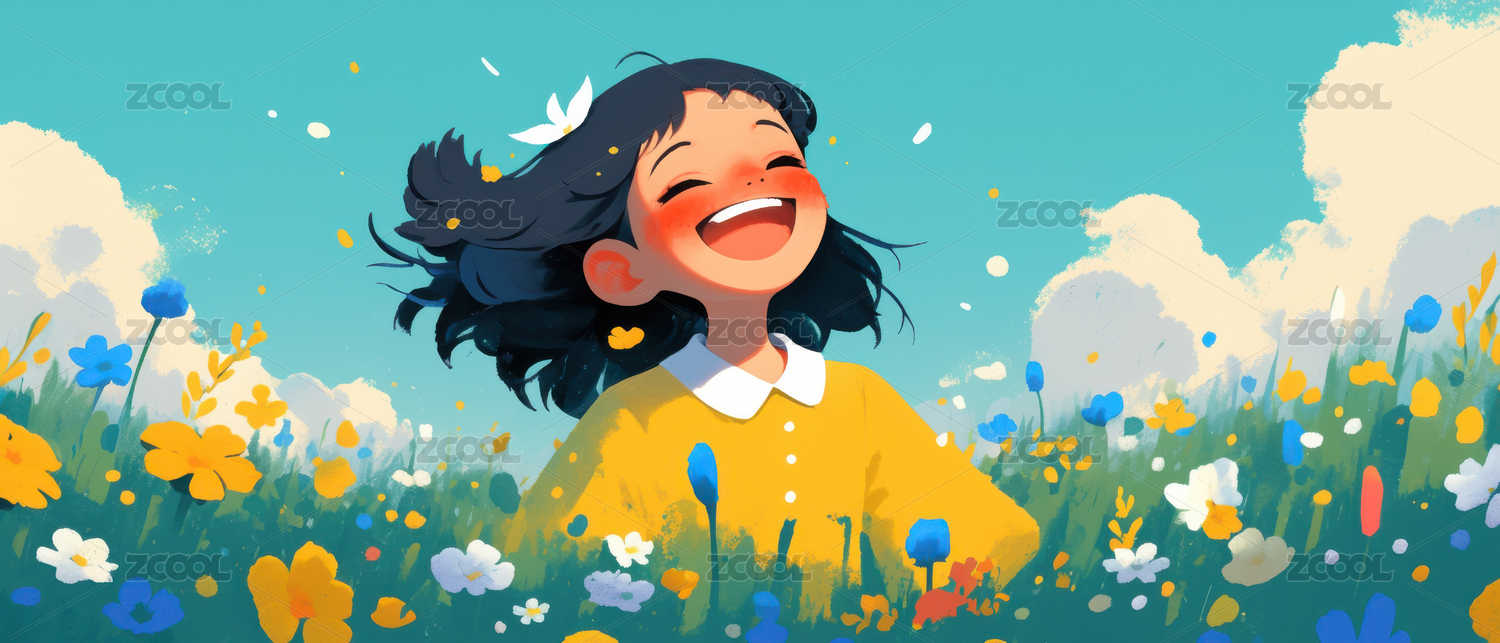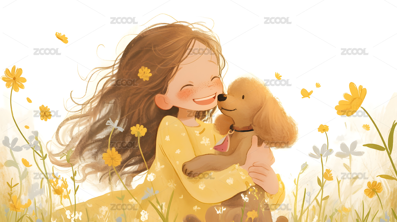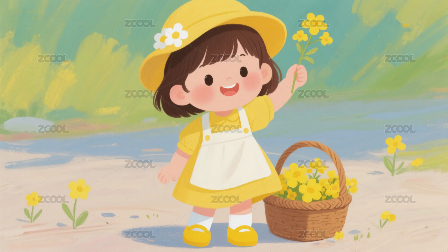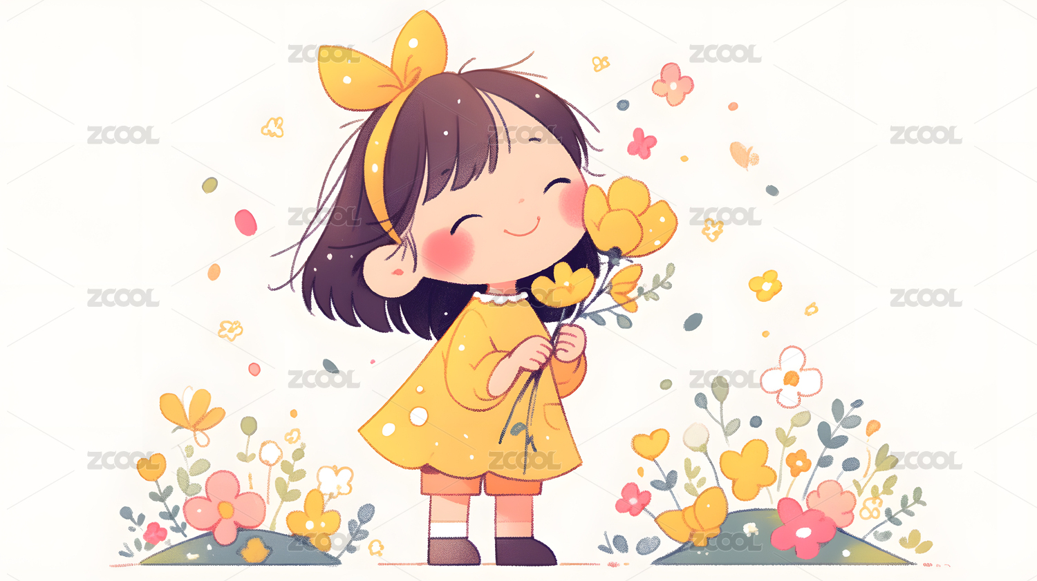 小女孩,风车,奔跑,快乐,雨靴,卡通,插画,微笑,辫子,连衣裙