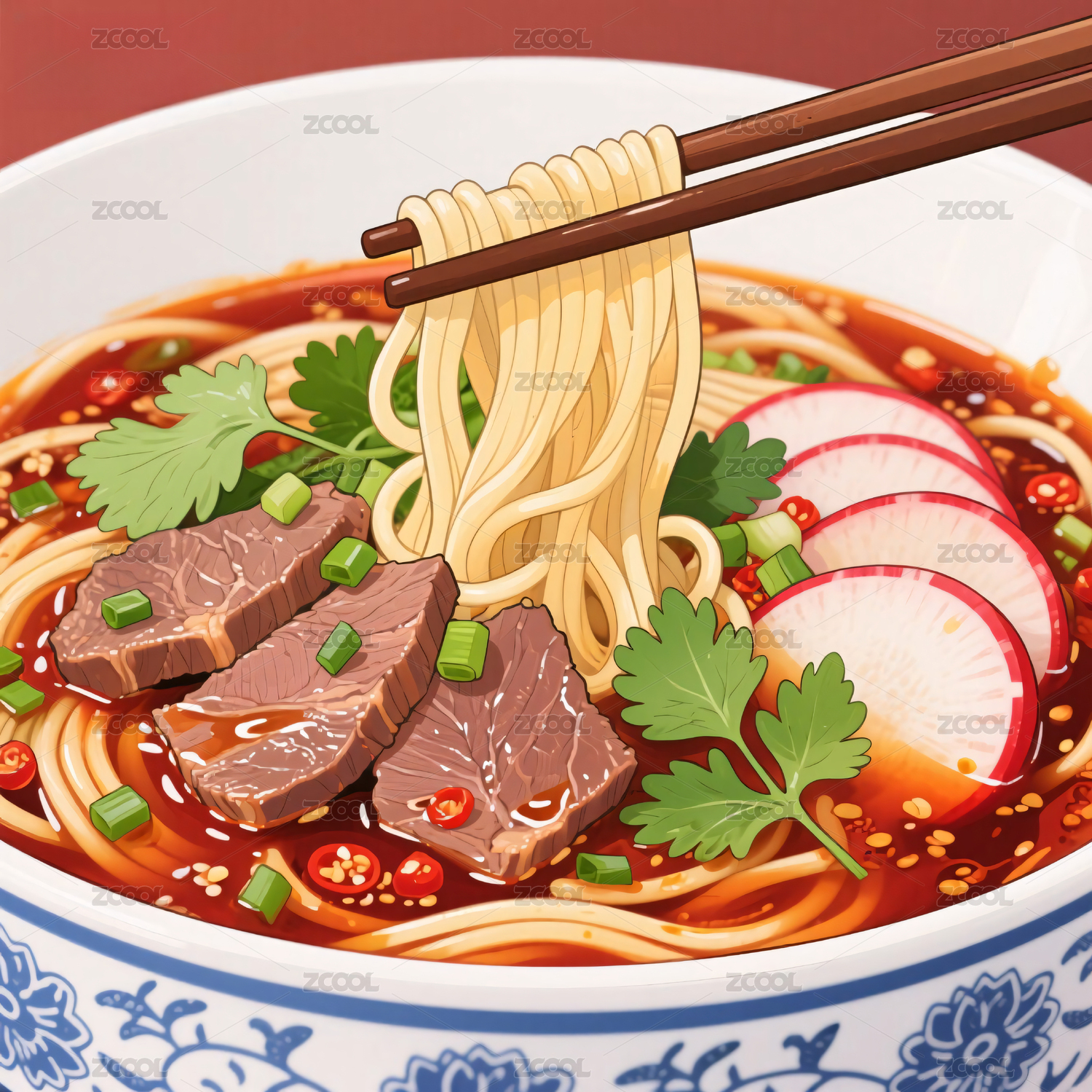 牛肉面,插画,香辣,面条,牛肉,汤面,中式,美食,筷子,葱花