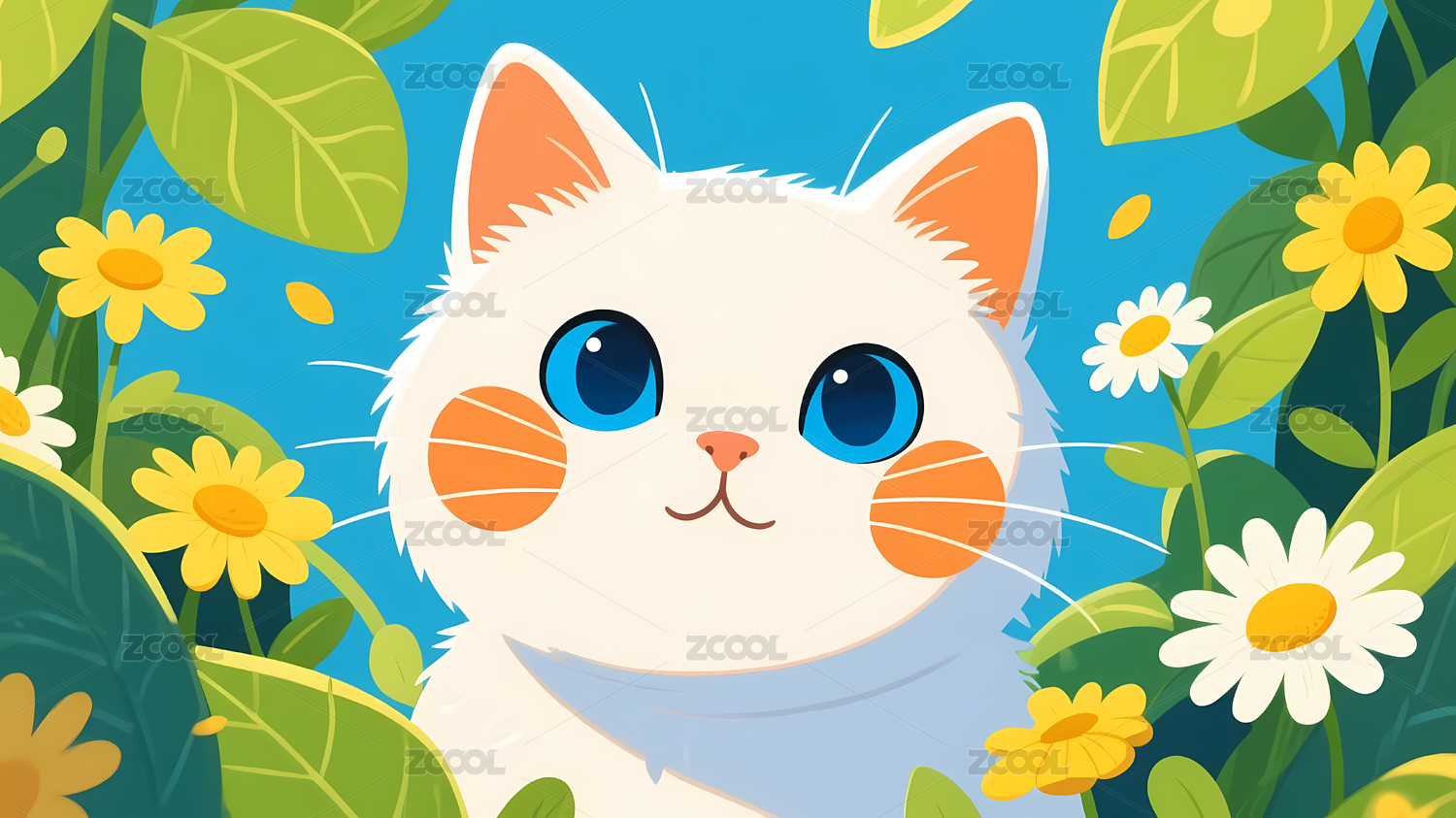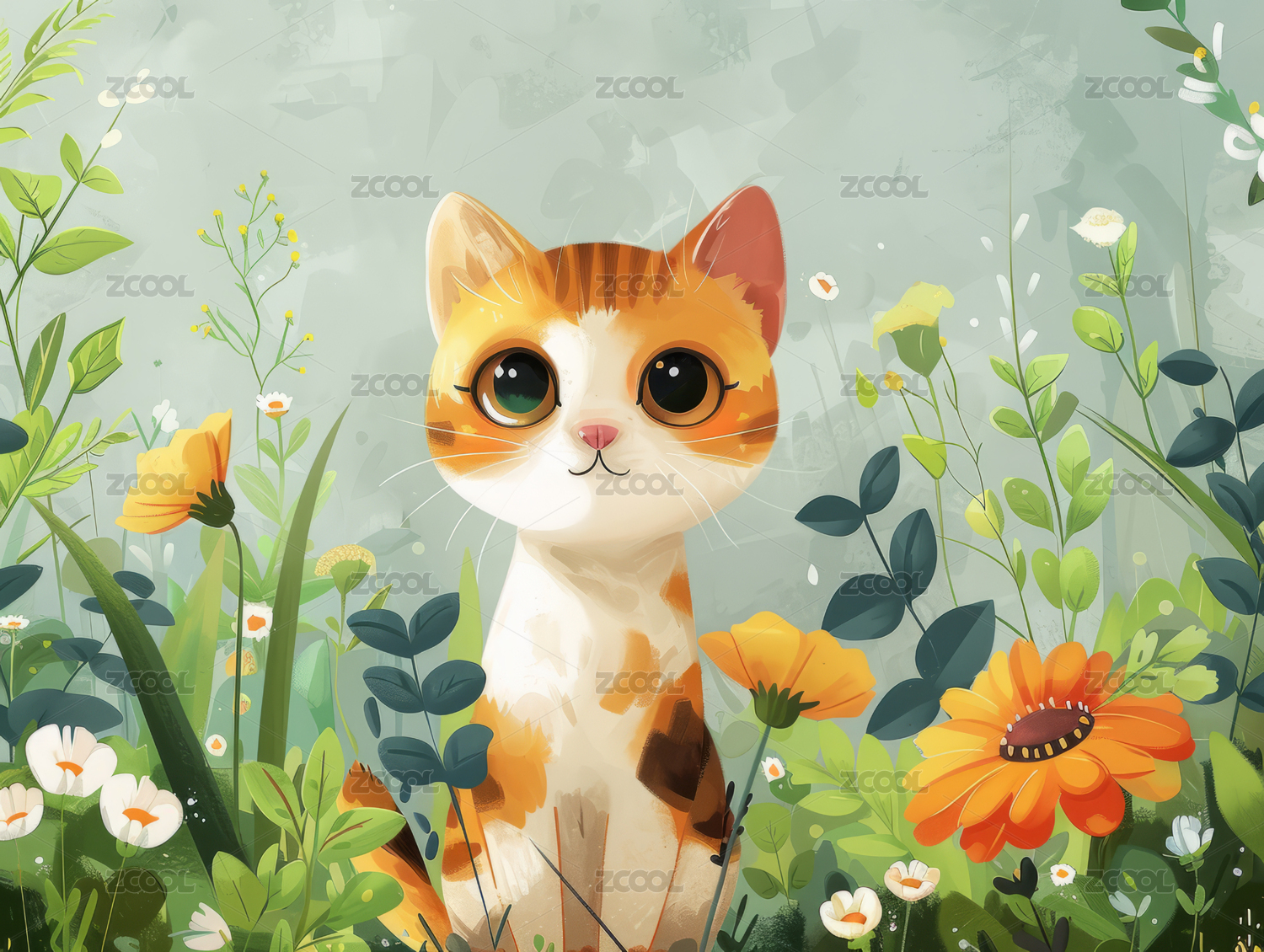 猫咪,向日葵,花丛,可爱,卡通,插画,阳光,花朵,草地,温馨