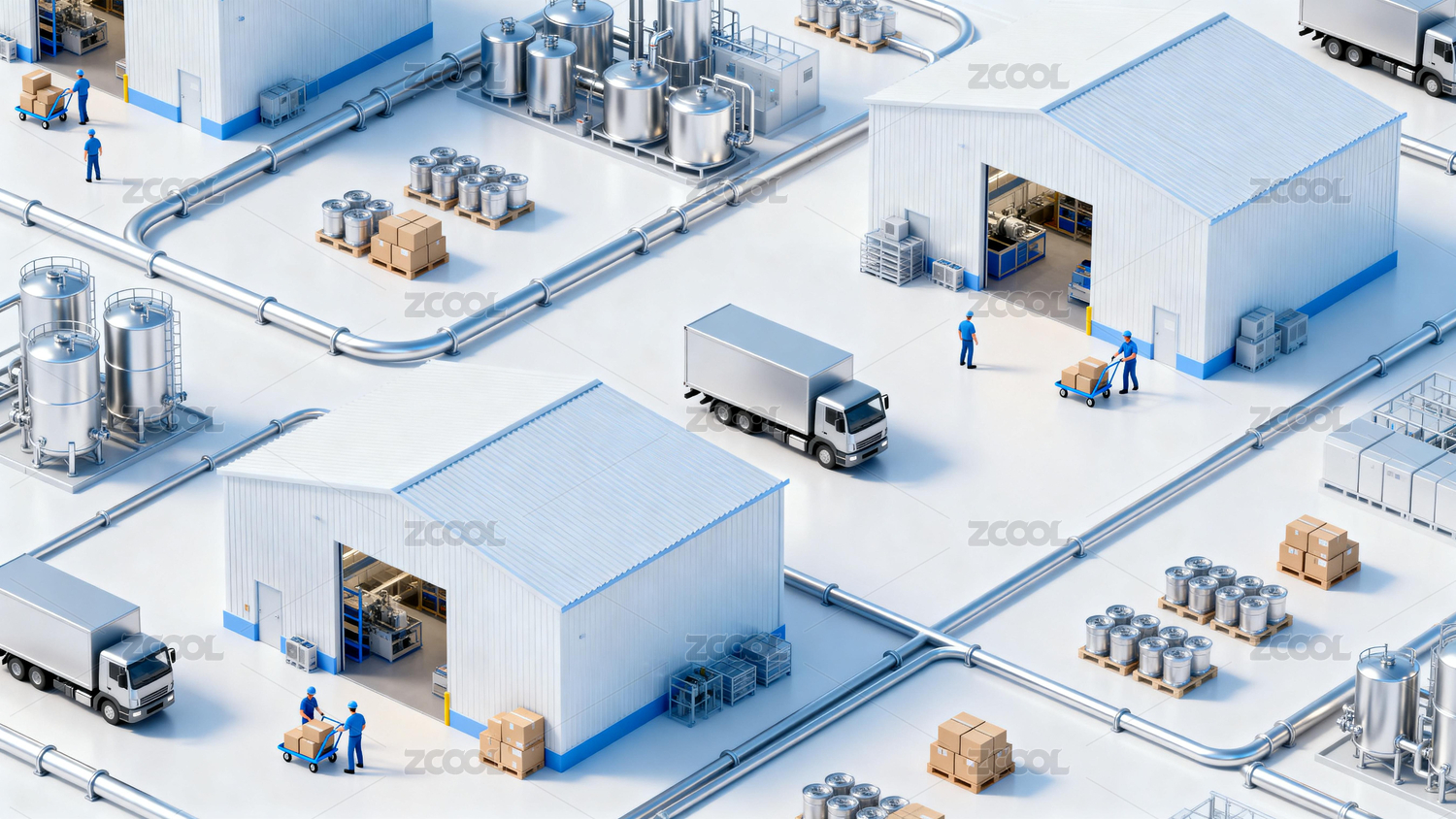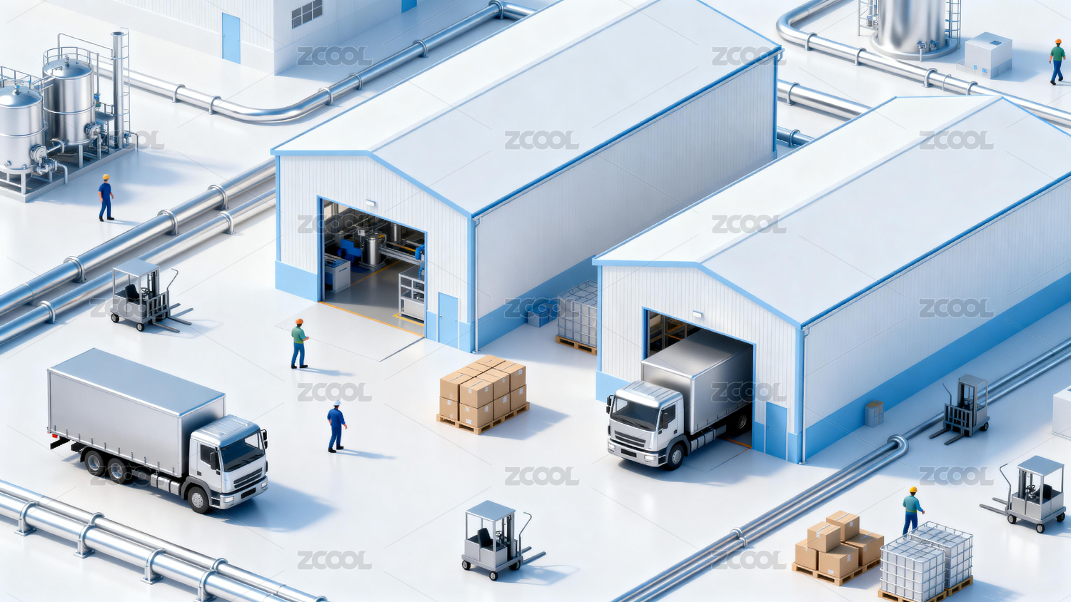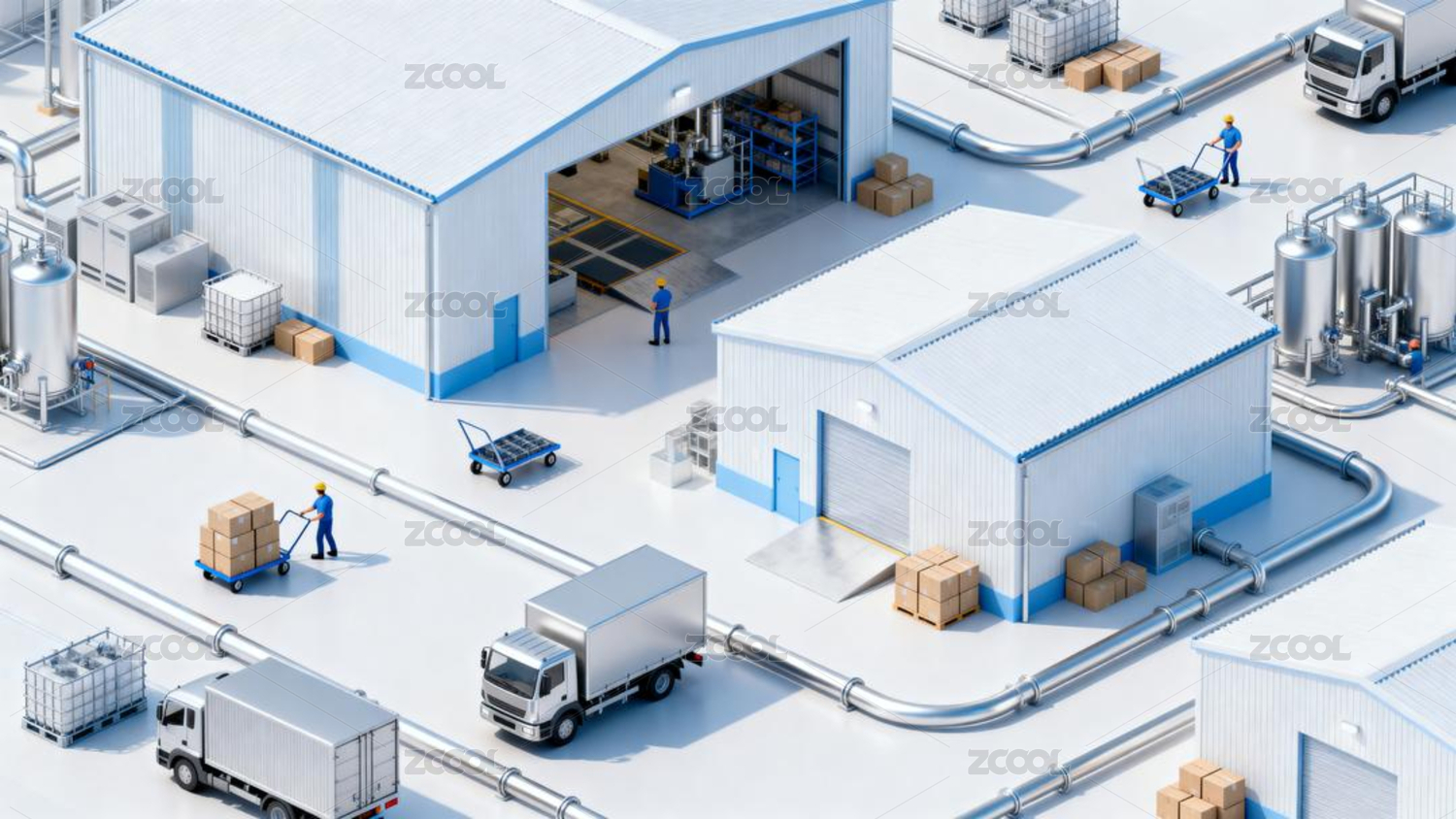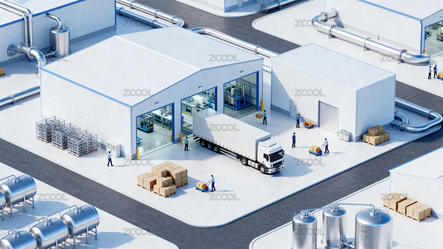 工厂,卡车,烟囱,建筑,屋顶,蓝色,红色,白色,货车,集装箱