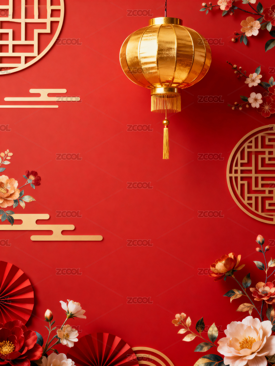 红色背景下的中式灯笼与花卉装饰
