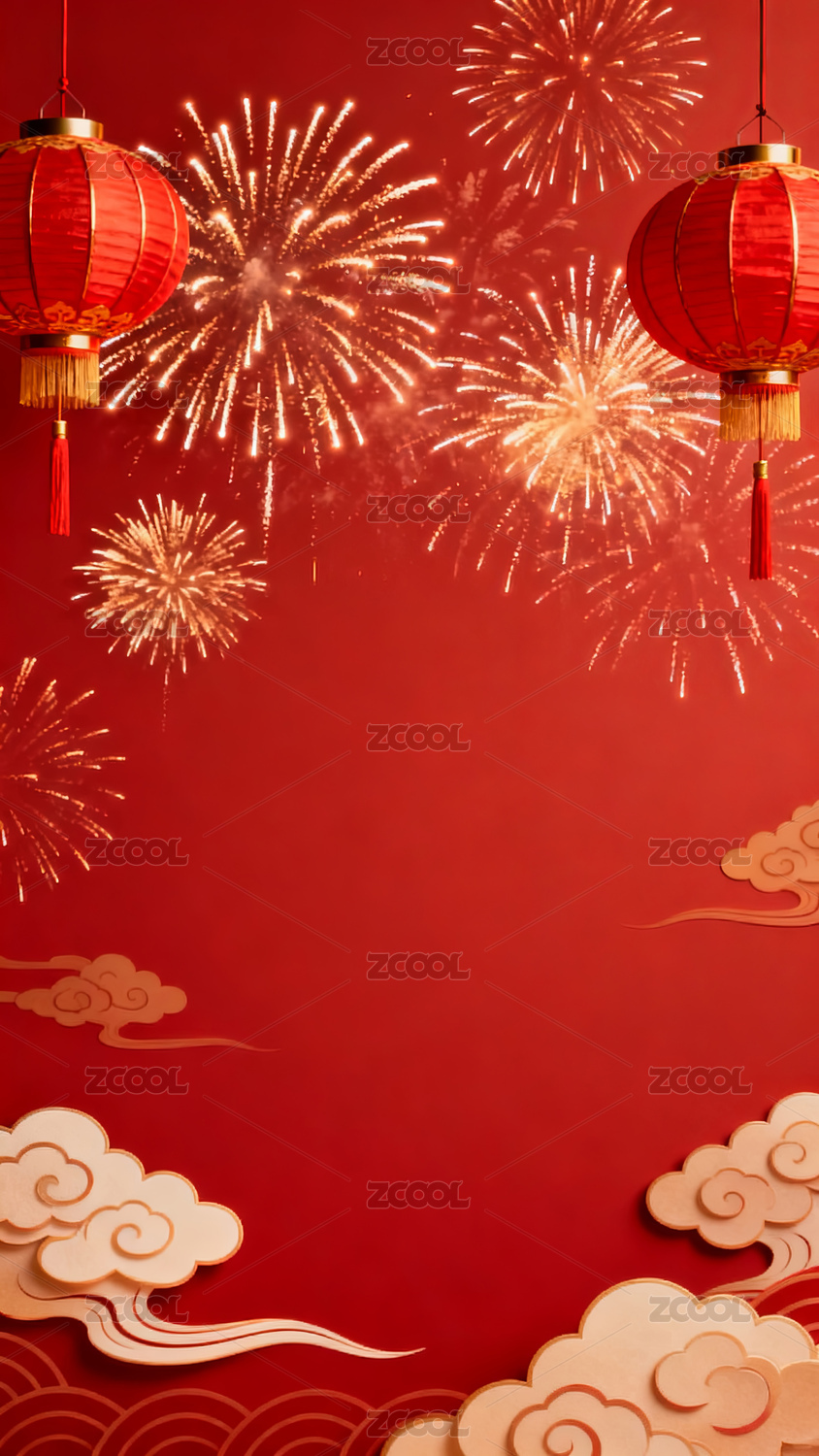 新年红色灯笼与烟花