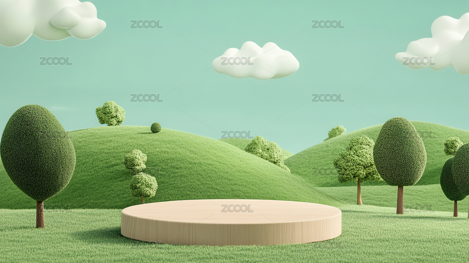 3D卡通 草地上的木质圆形展台
