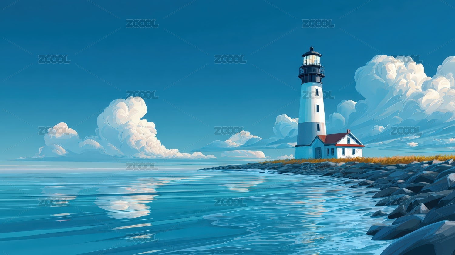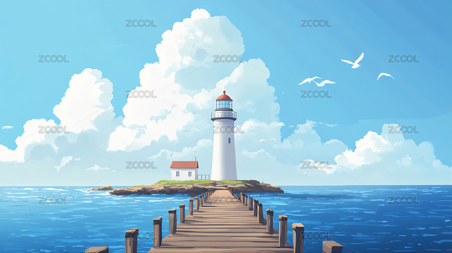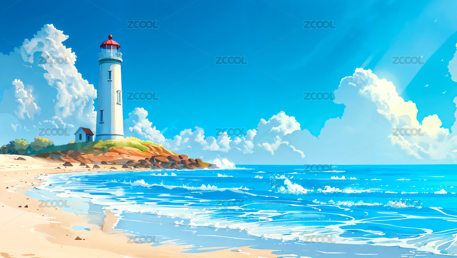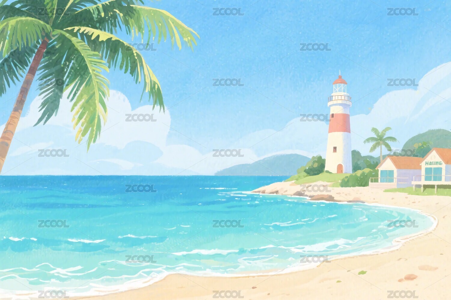 灯塔,水彩画,海景,帆船,棕榈树,热带,海岸,蓝色,海洋,天空