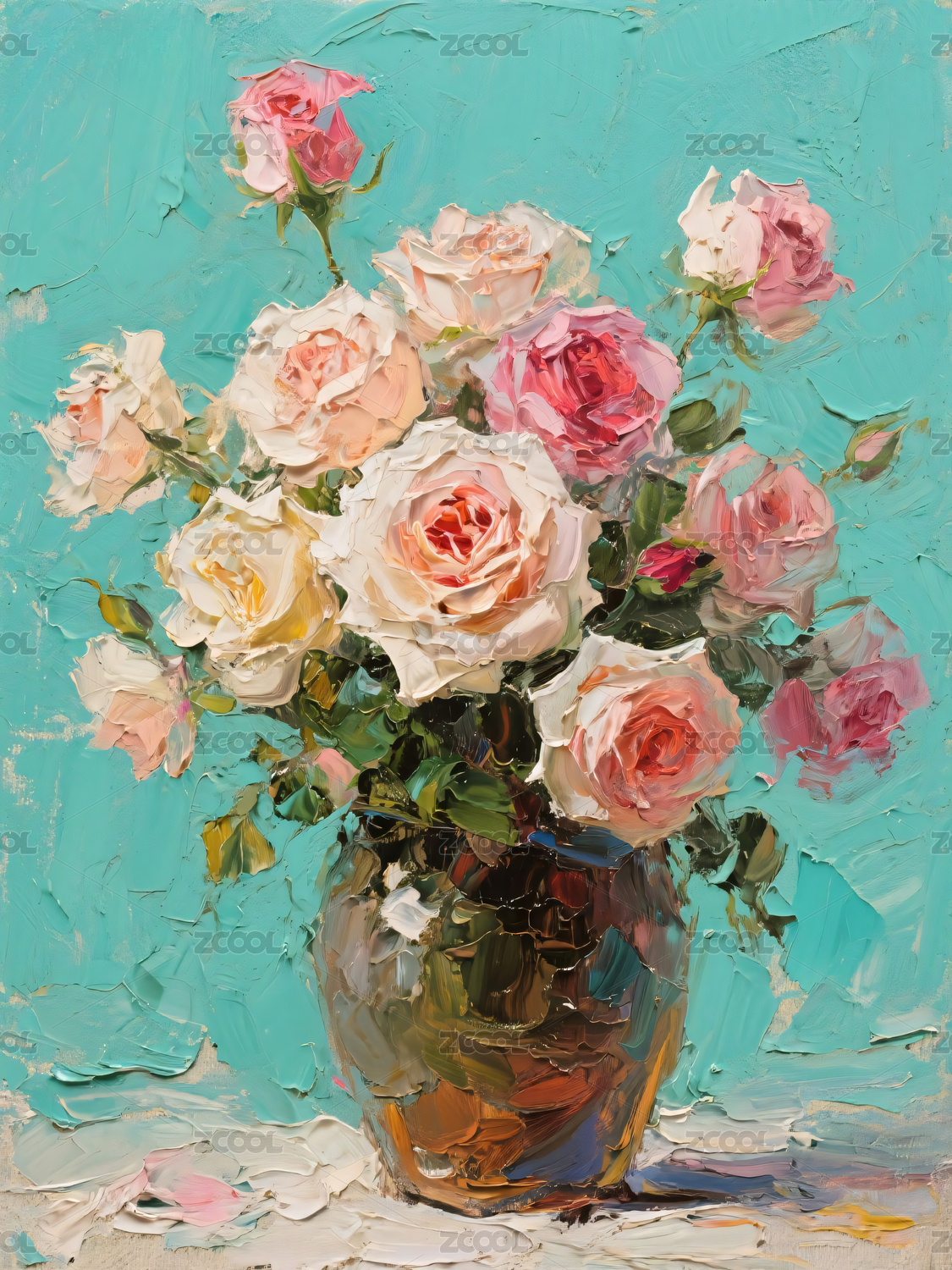 玫瑰花,油画,陶罐,插花,花卉,艺术,手绘,花瓶,花瓣,复古