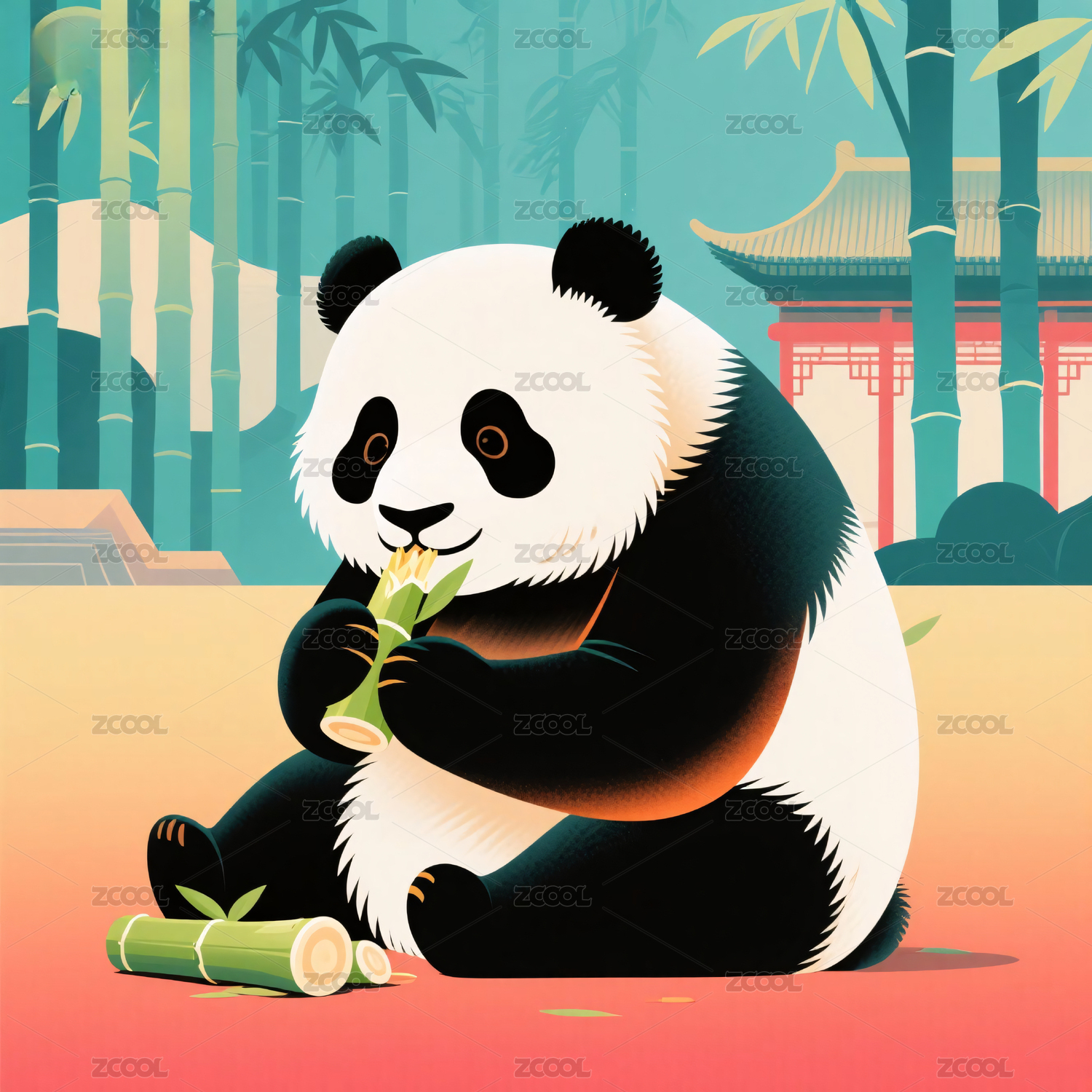 熊猫,竹笋,竹林,古风建筑,中国风,插画,古建筑,竹子,可爱,动物