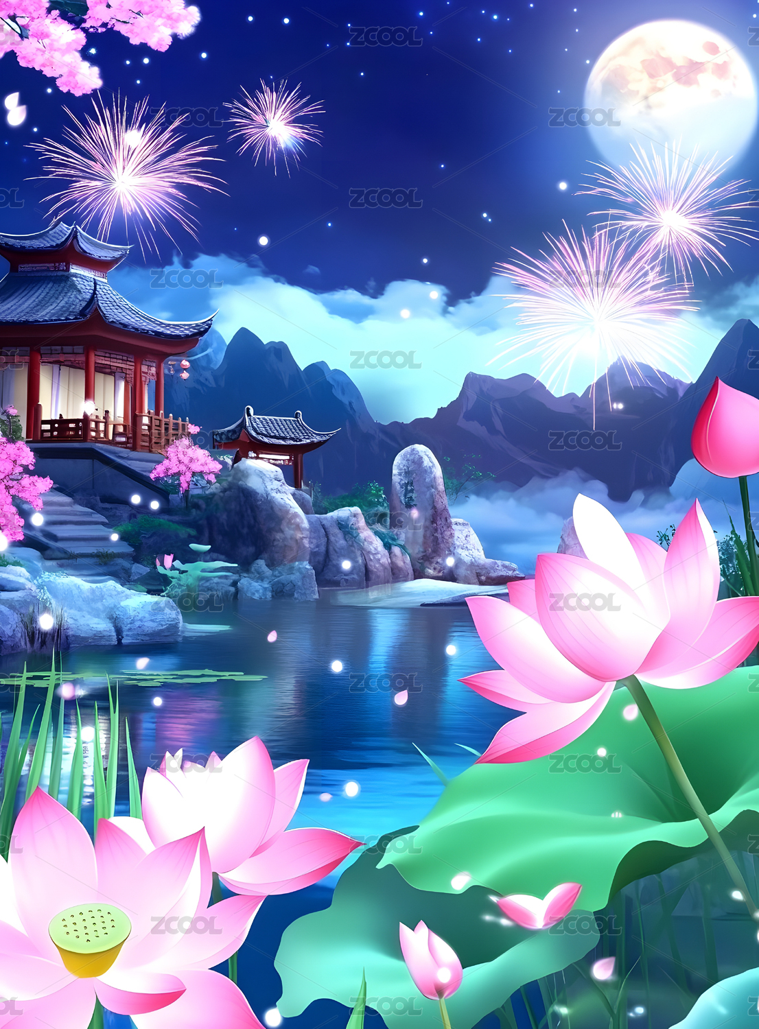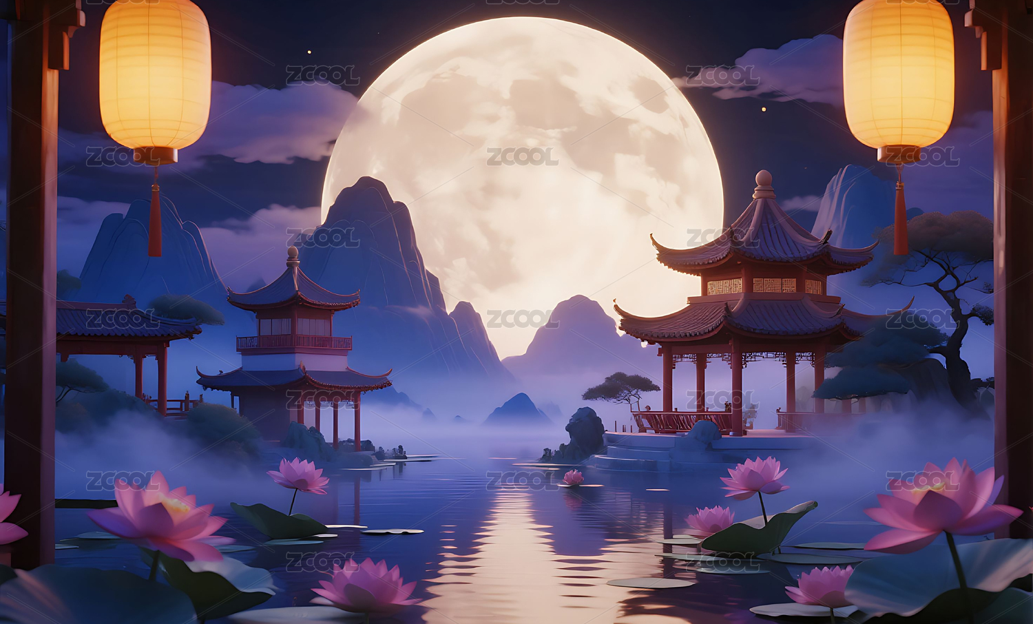 中秋节,夜晚,插画,背景,壁纸,设计,3D,月亮,中式,紫色