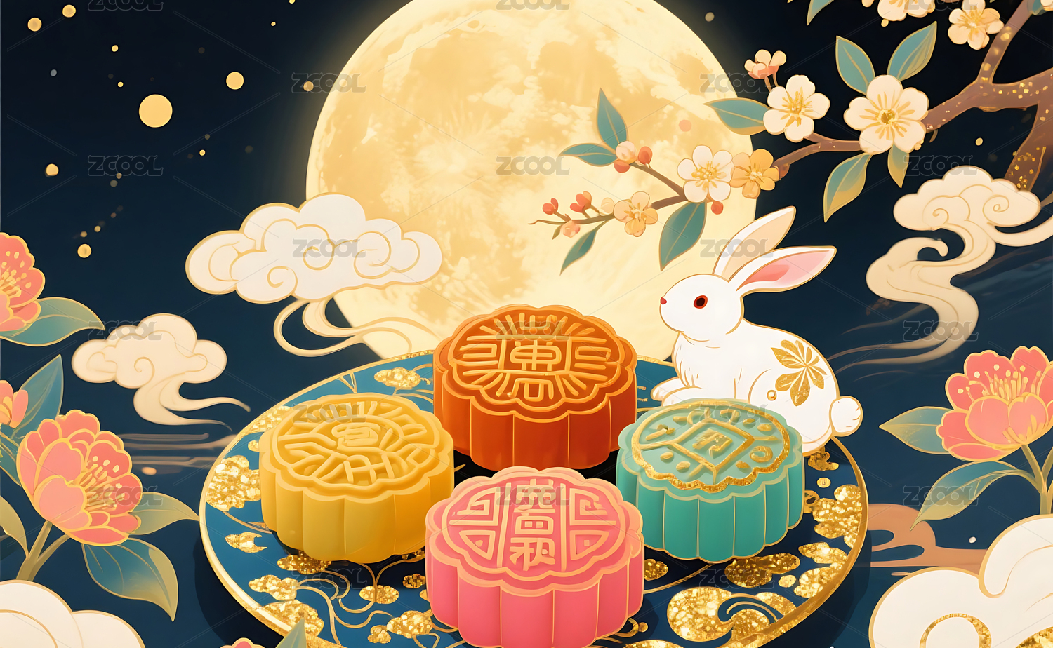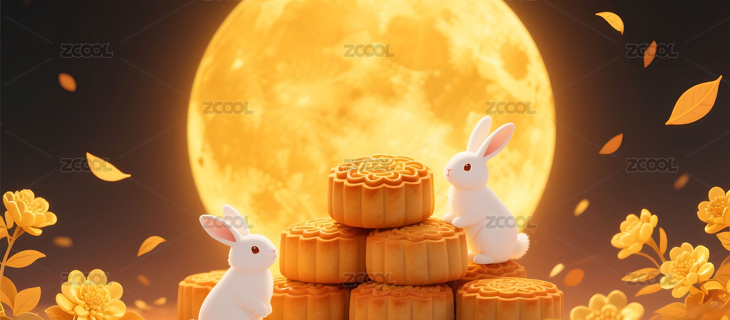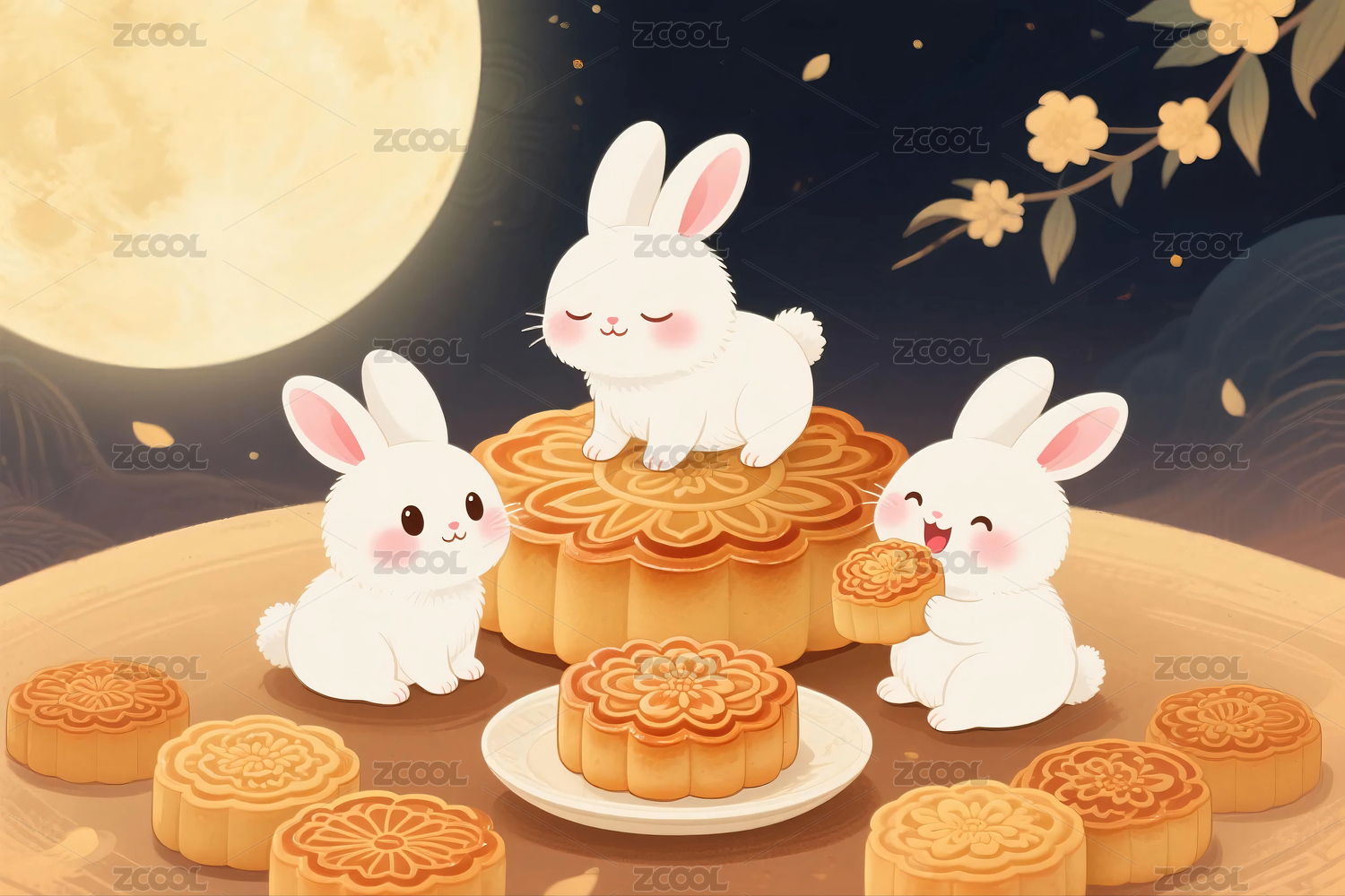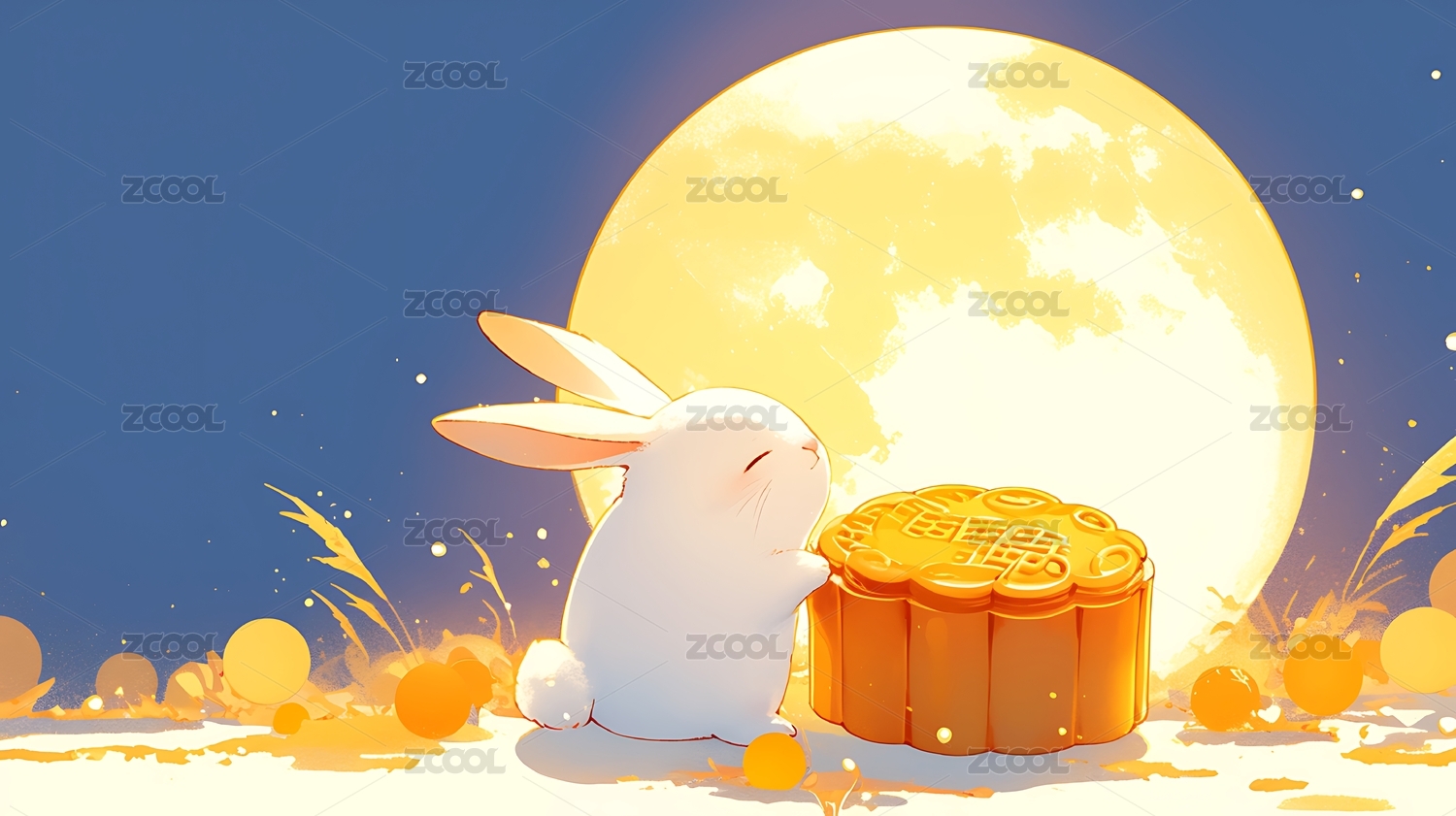 中秋节月亮下的月饼和玉兔插画背景壁纸