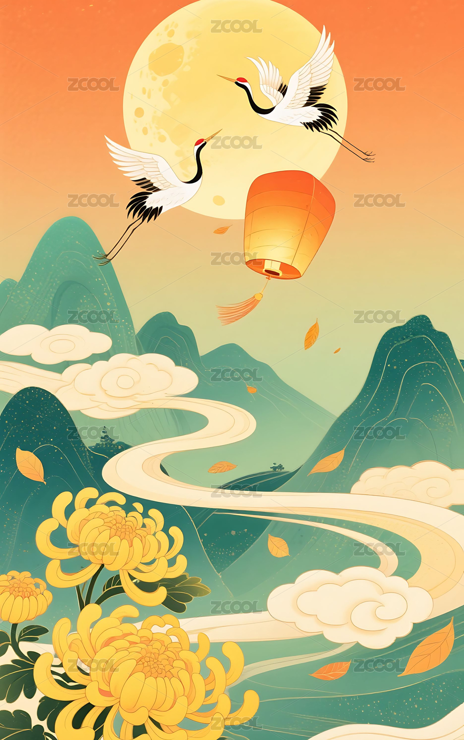 中秋节,中式,插画,海报,孔明灯,山水,仙鹤,月亮,菊花,云雾