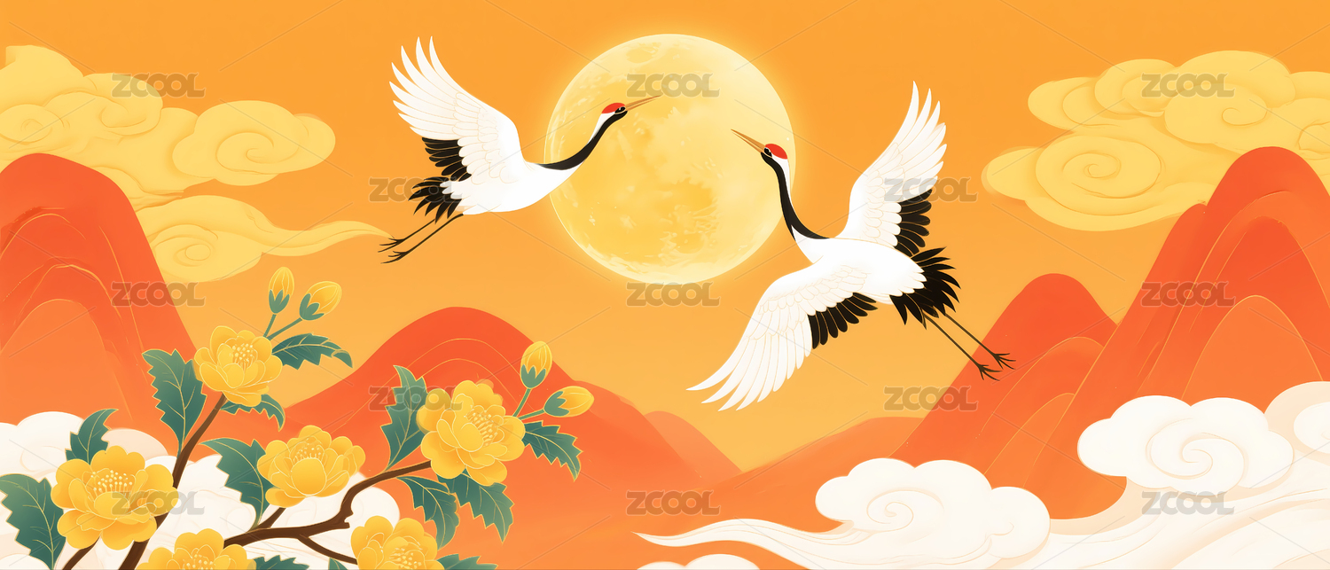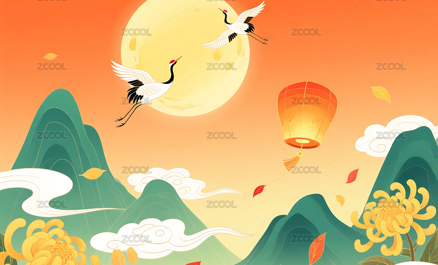 中秋节中式山水仙鹤月亮菊花插画背景壁纸