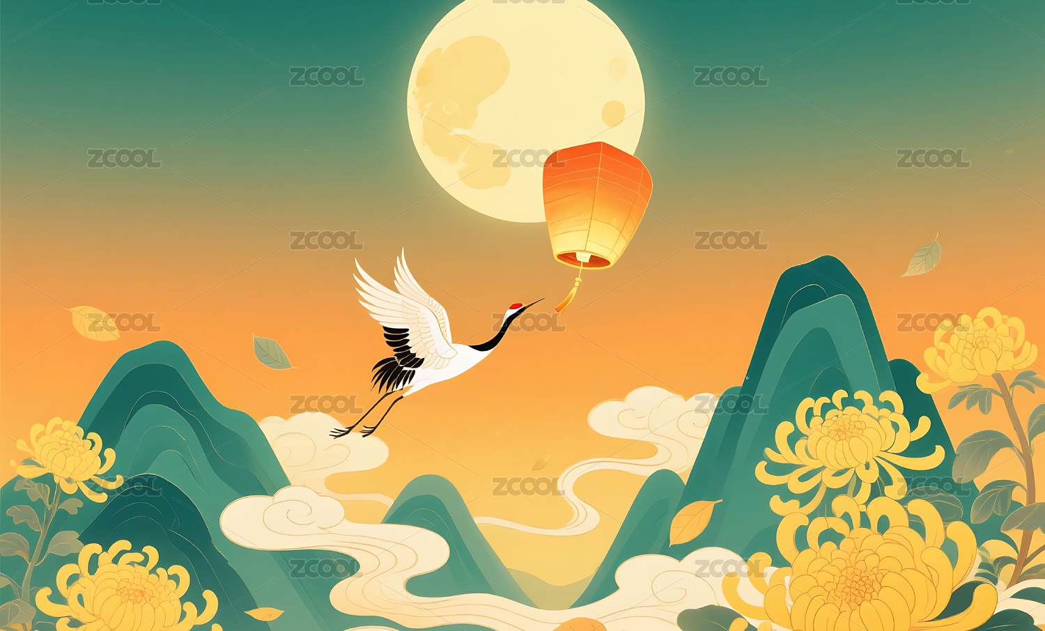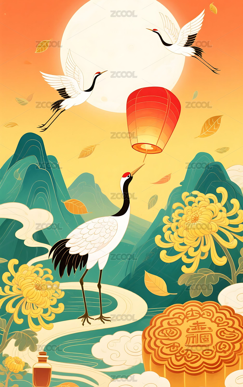 中秋节,中式,插画,海报,孔明灯,山水,仙鹤,月亮,菊花,云雾