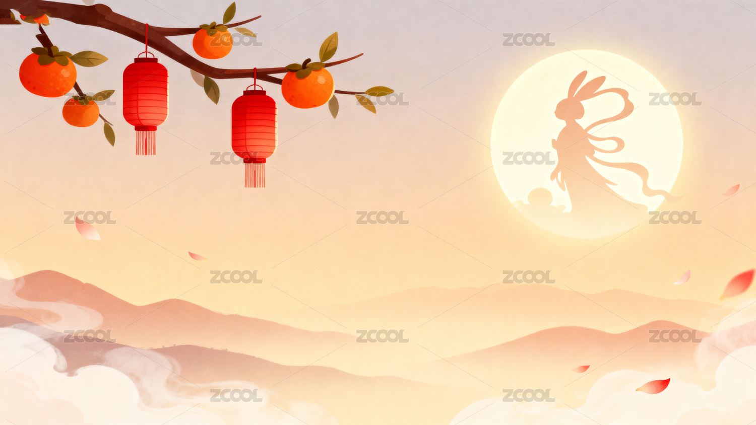 中秋节,月亮,玉兔,兔子,插画,海报,云雾,桂花,桂花树,中式