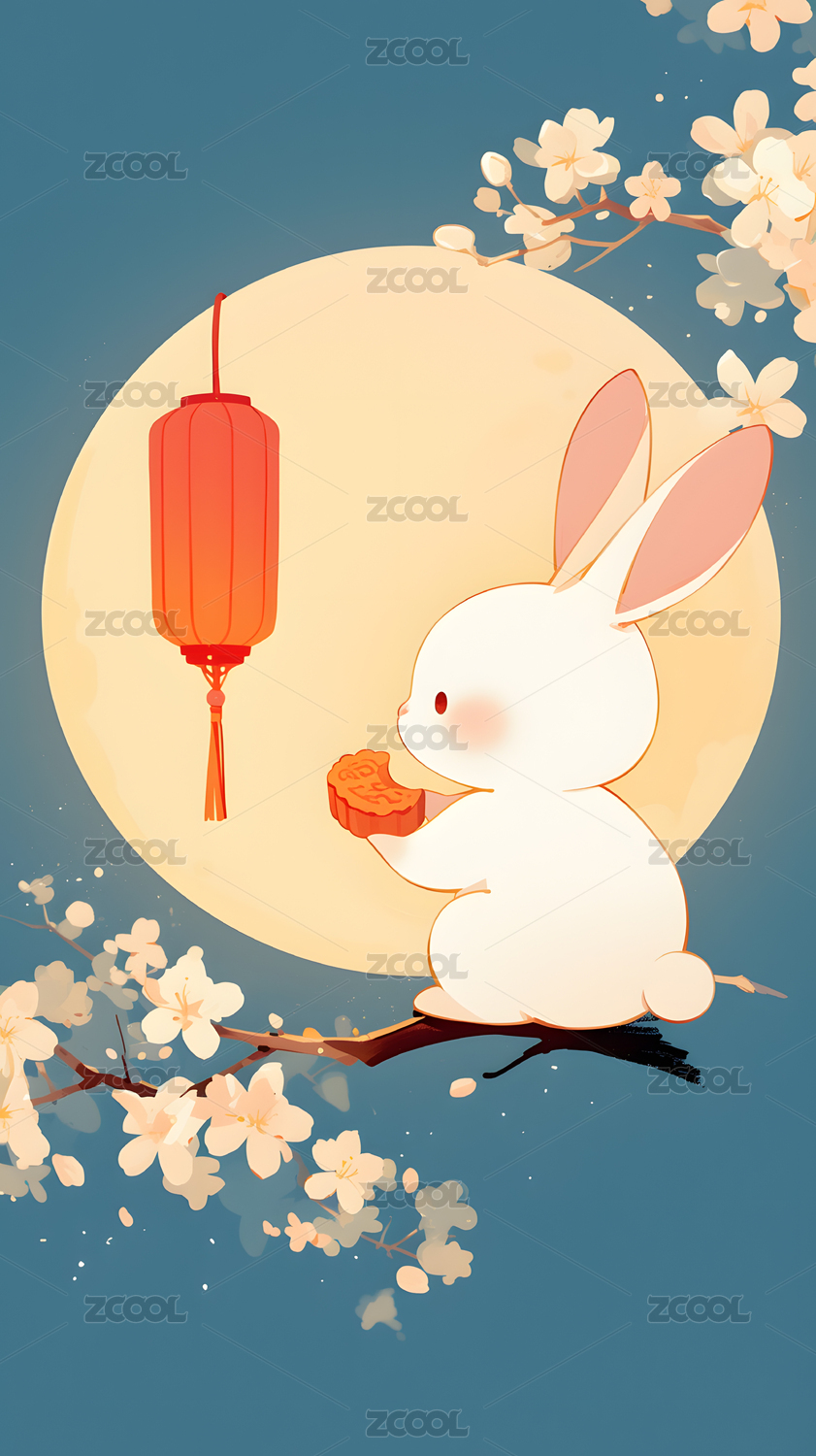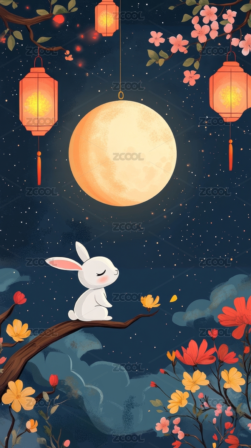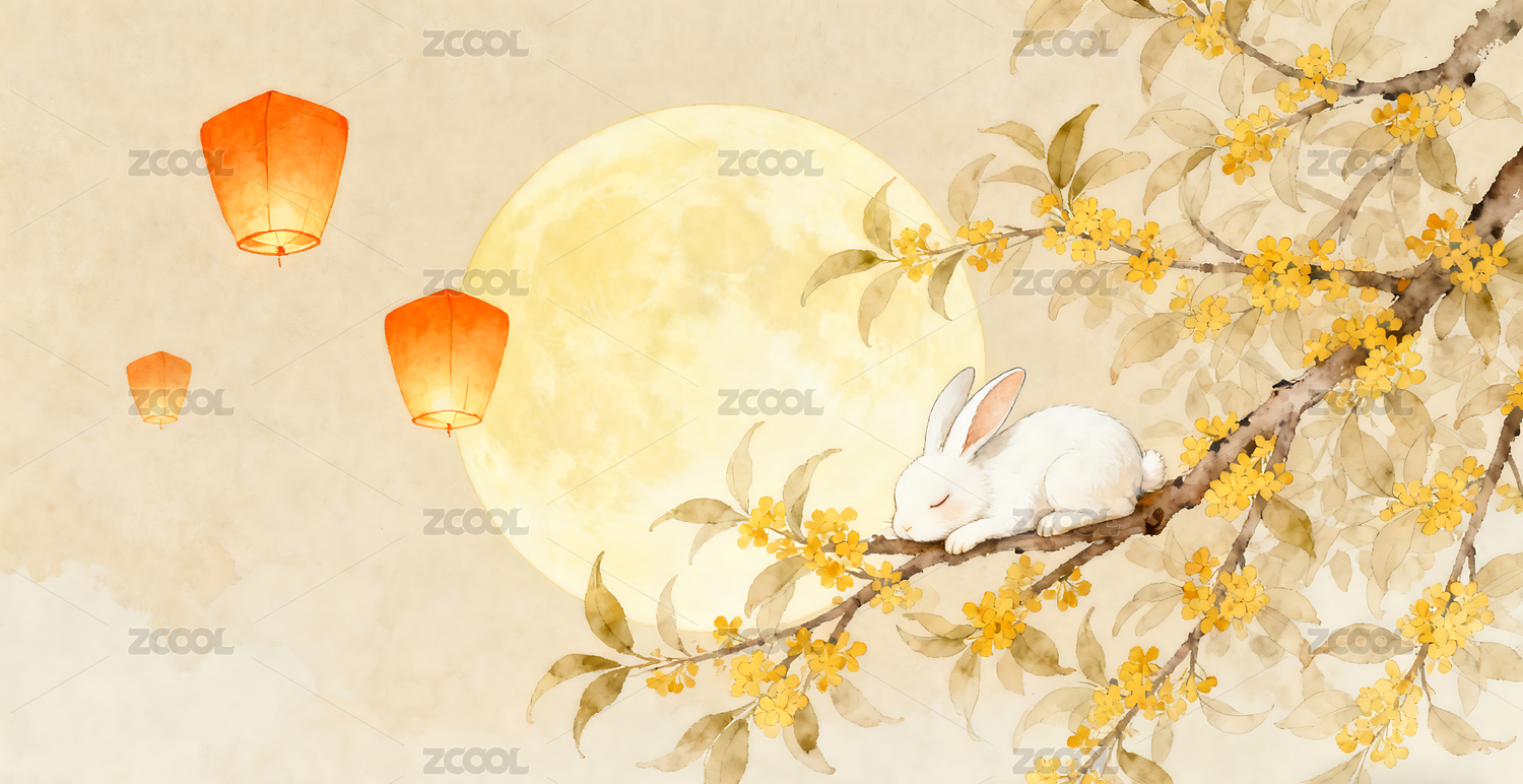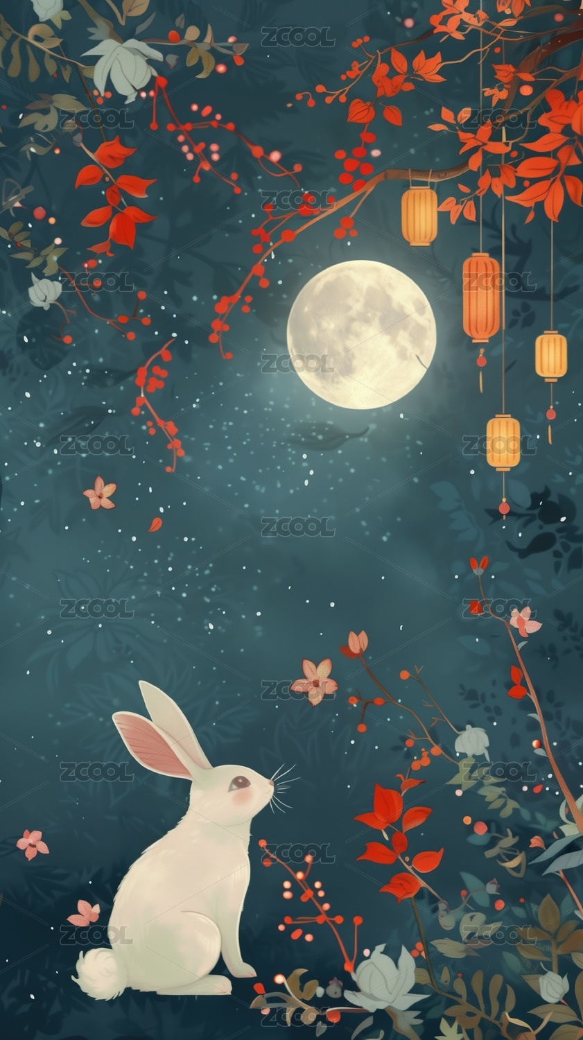 中秋节,桂花,桂花树,兔子,玉兔,插画,月亮,孔明灯,传统