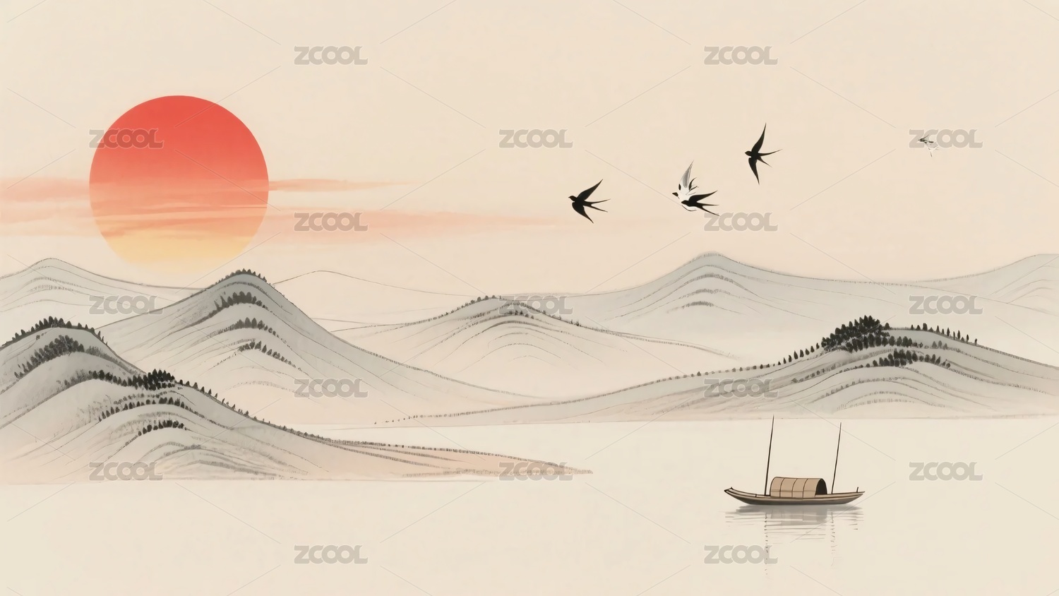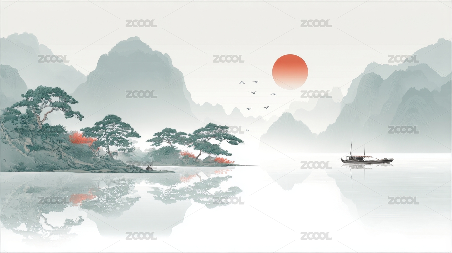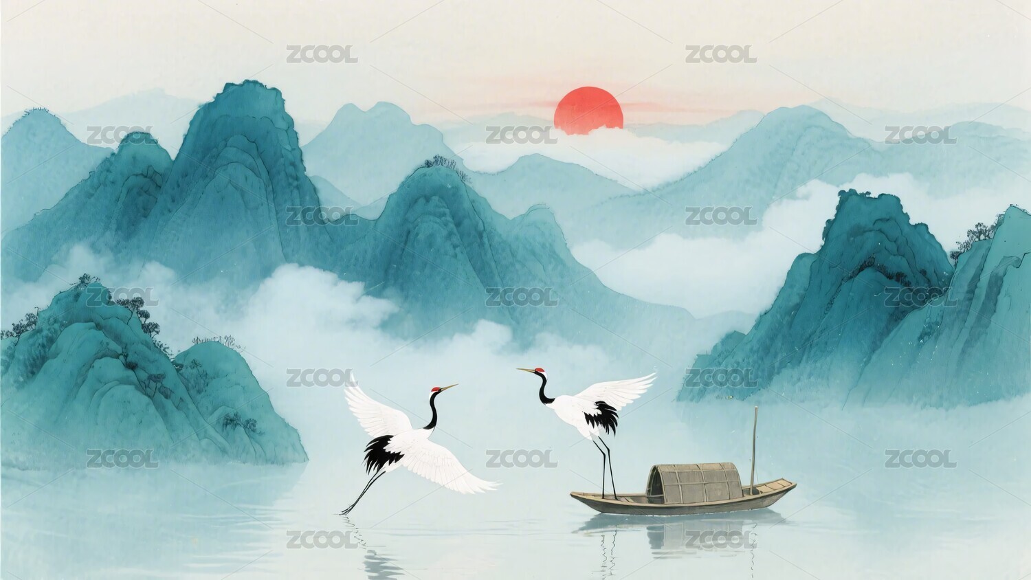日出,湖景,白鹤,木船,薄雾,宁静,自然景观,松树,山脉,水墨风格