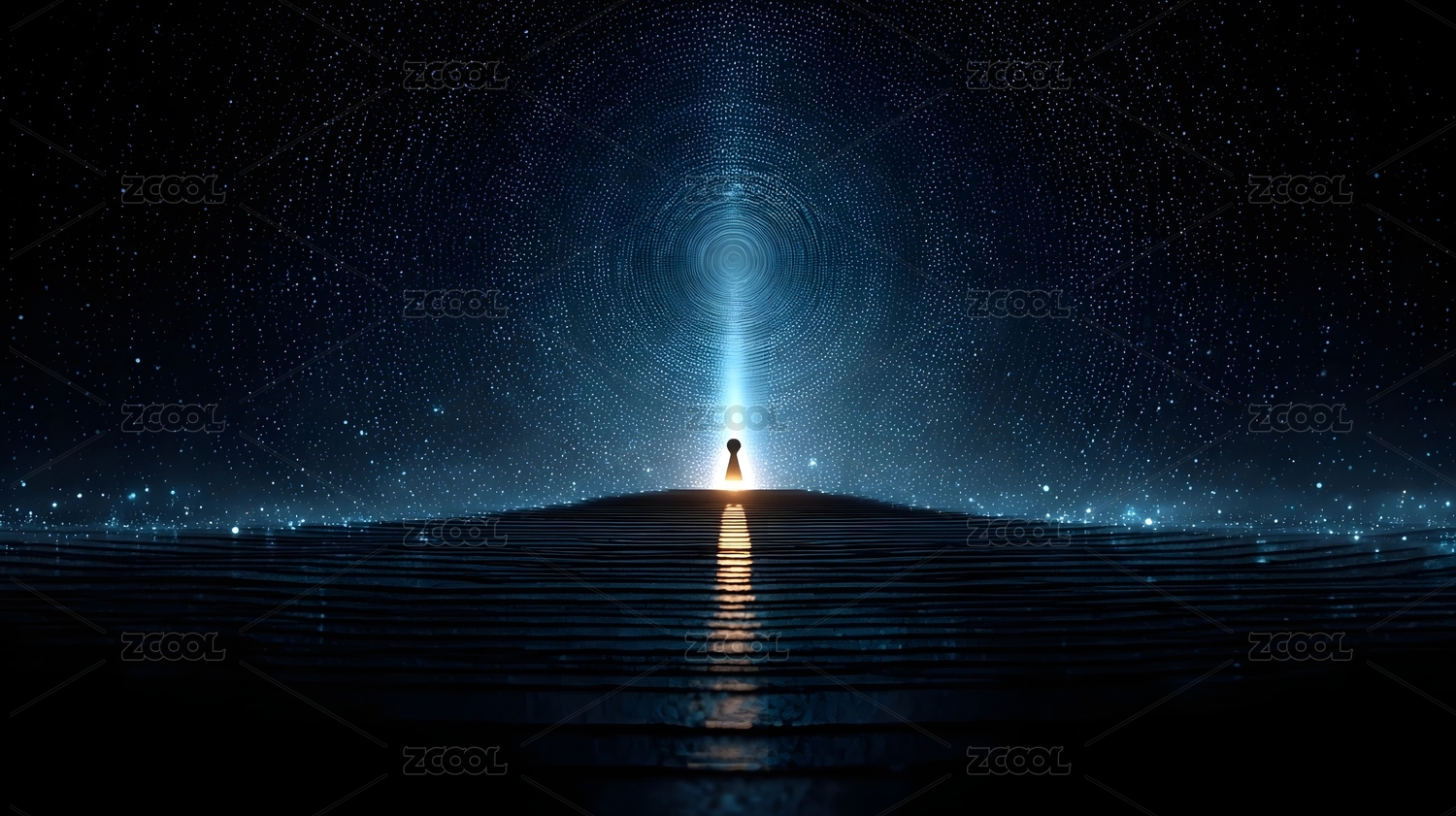 宁静,科幻风格,宇宙星空,蓝色光柱,星云,探索未知,神秘感,启示,剪影人物,深邃