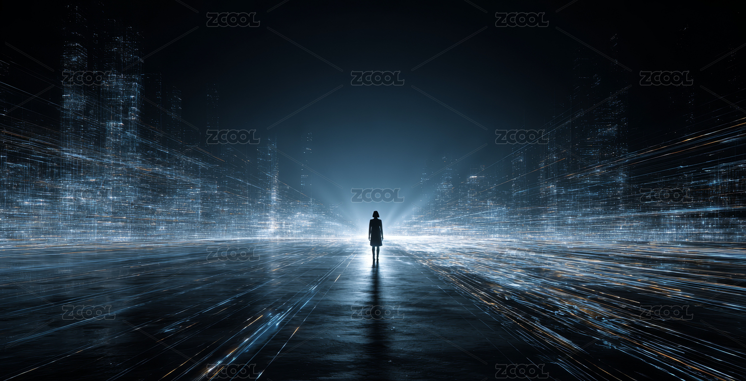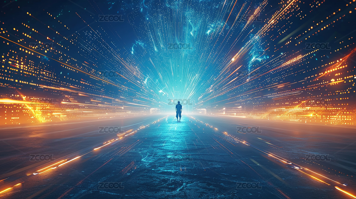宁静,科幻风格,宇宙星空,蓝色光柱,星云,探索未知,神秘感,启示,剪影人物,深邃