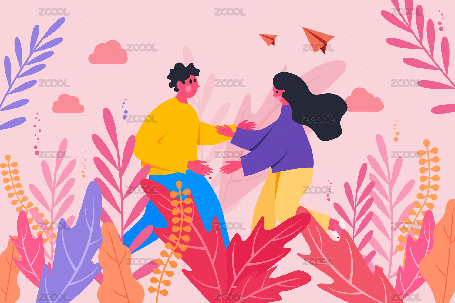 植物从中行走的情侣插画