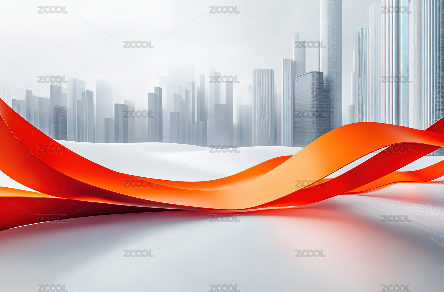 橙白相间的抽象波浪形建筑模糊的城市天际线