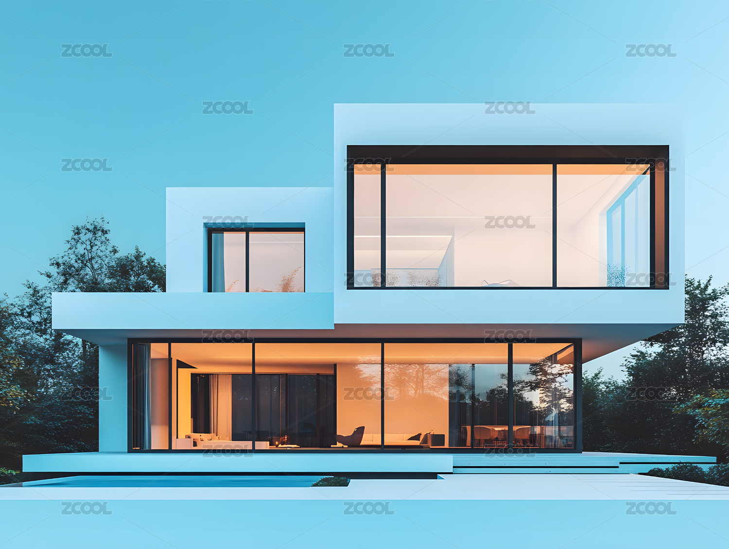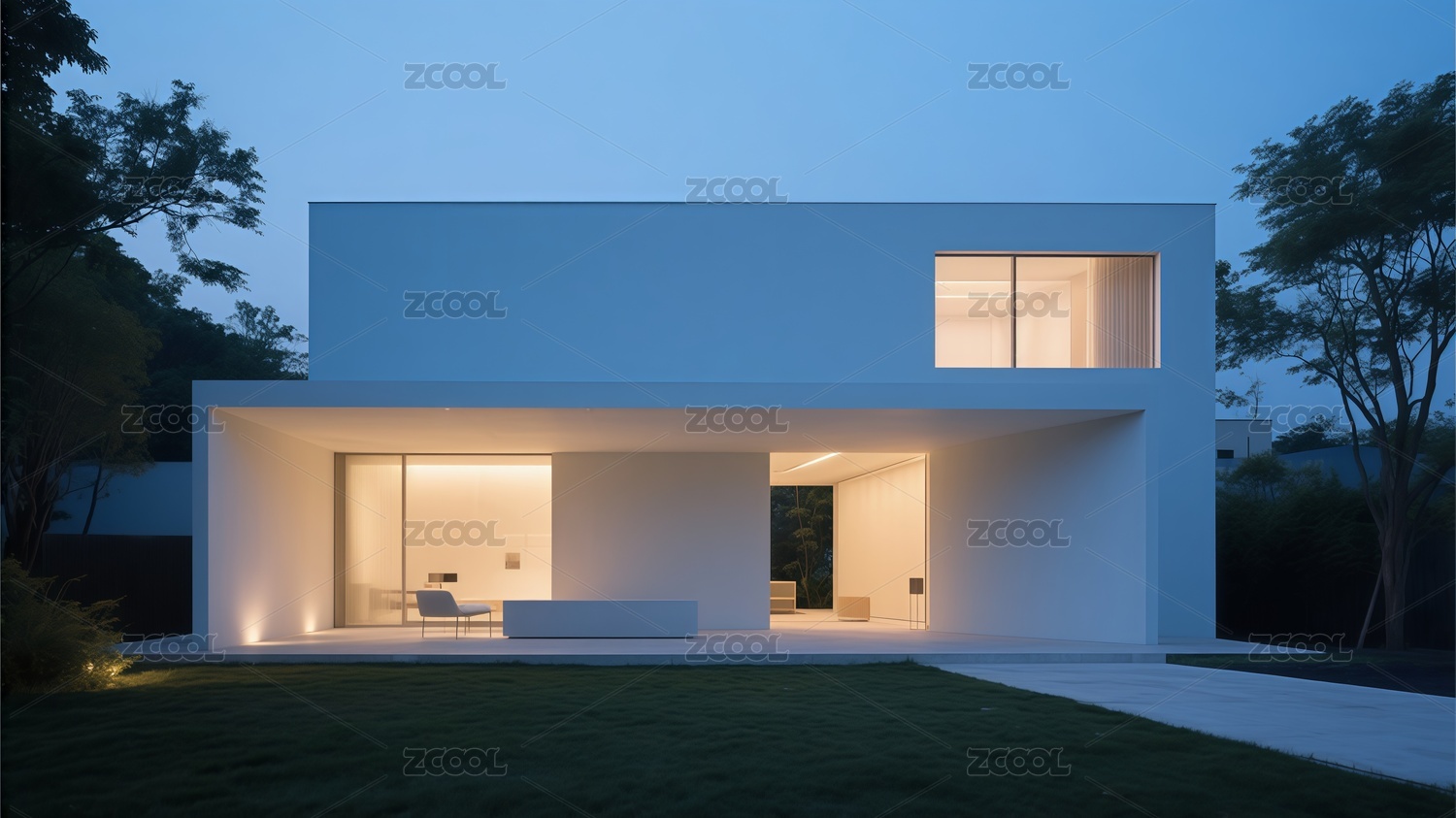 现代,极简,别墅,傍晚,蓝调,白色,建筑,玻璃窗,室内,静谧