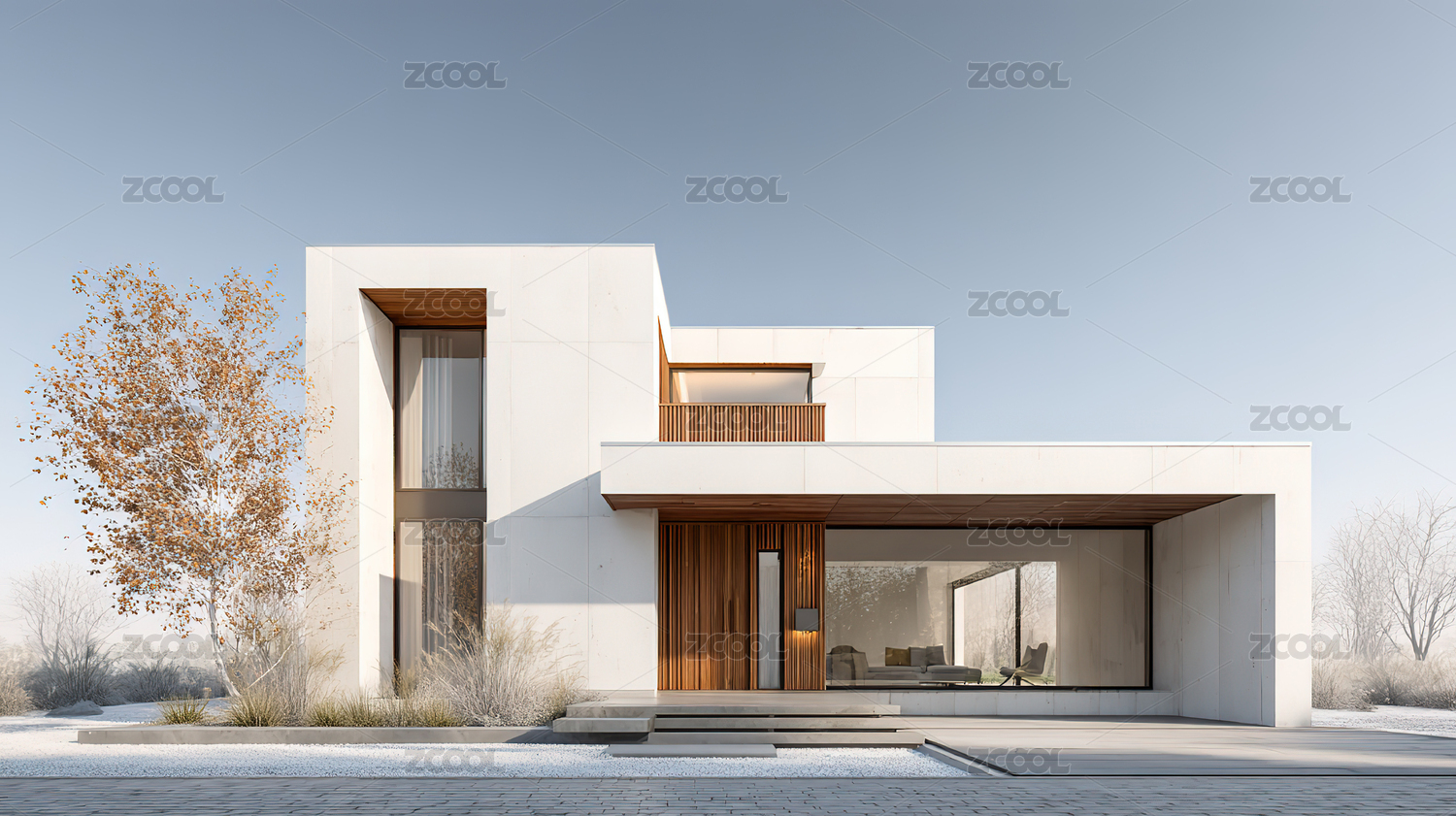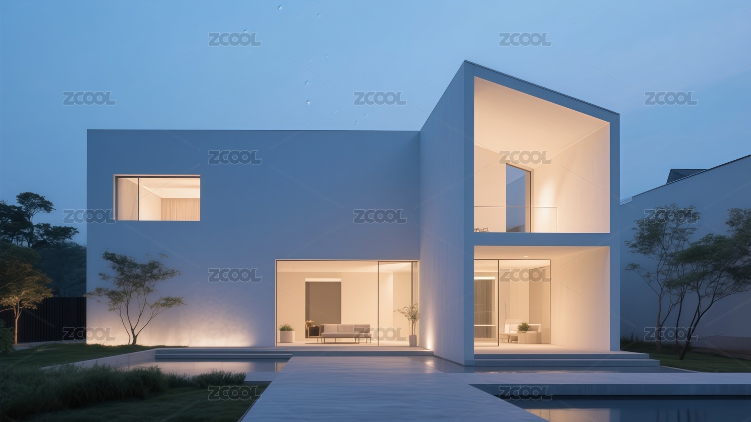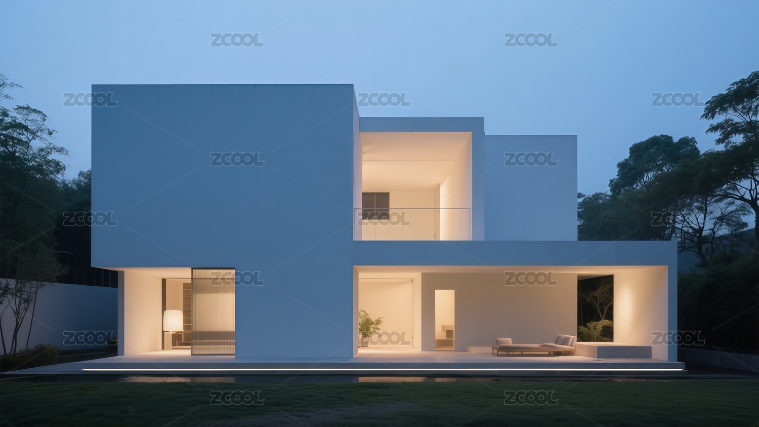 现代,极简,别墅,傍晚,蓝调,白色,建筑,玻璃窗,室内,静谧
