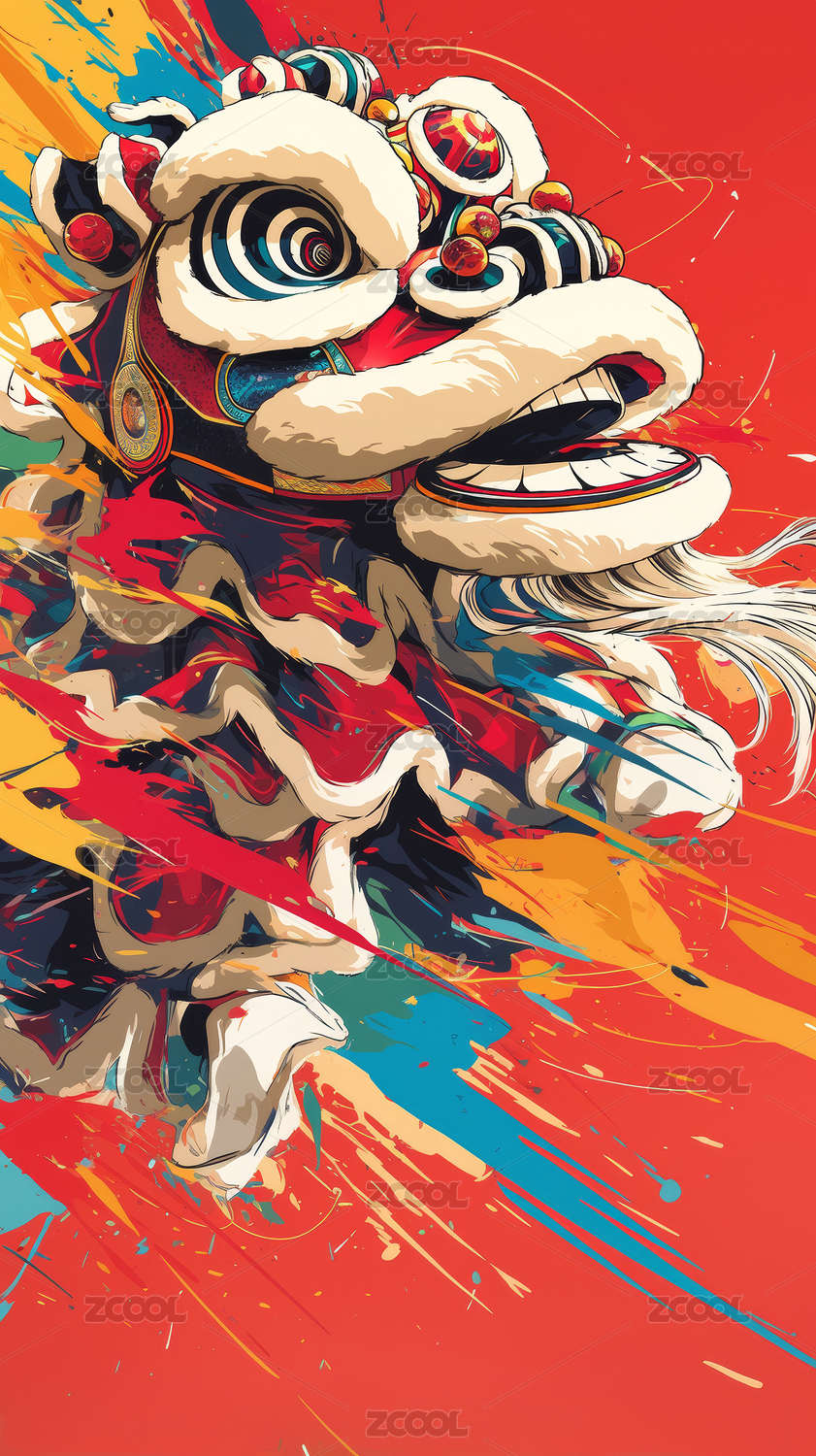 扁平化新年国潮风格醒狮喜庆氛围插画