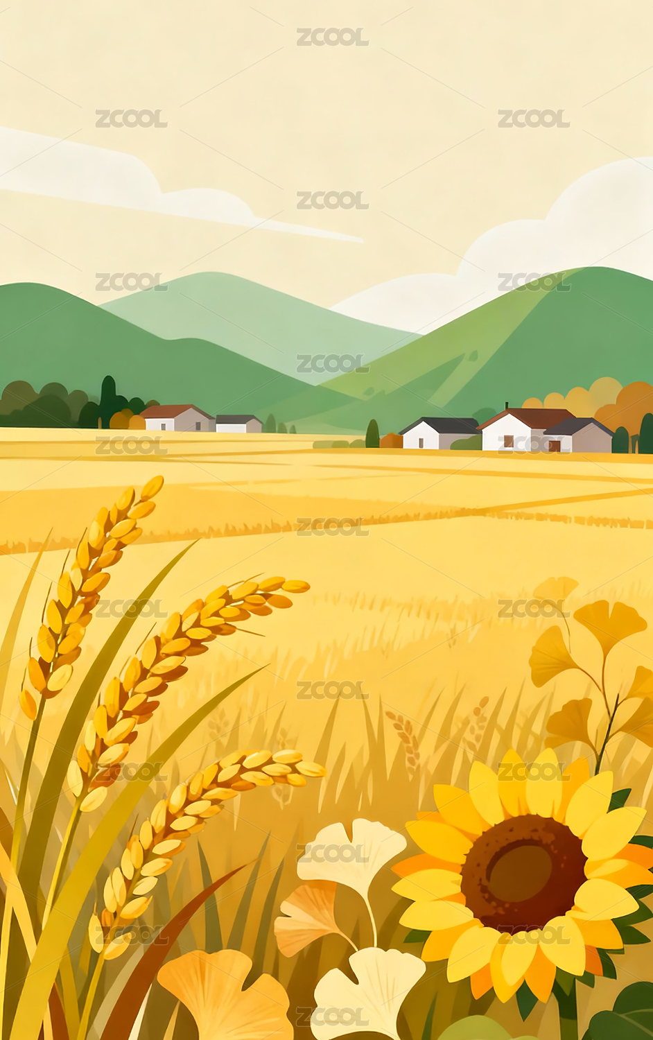 秋天,户外,田野,田园,稻田,插画,向日葵,稻谷,银杏树,暖色