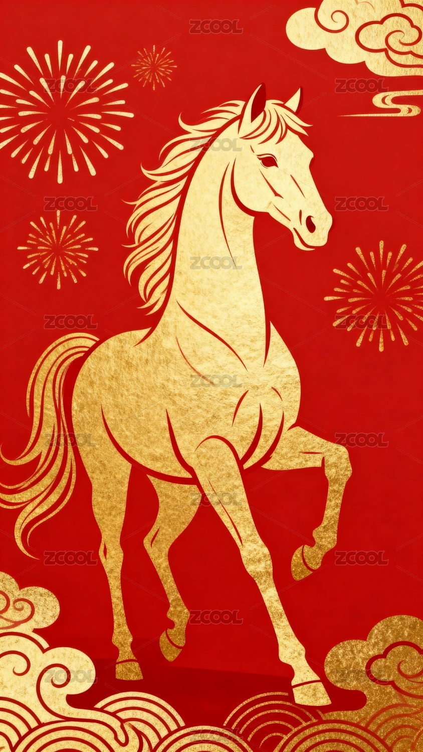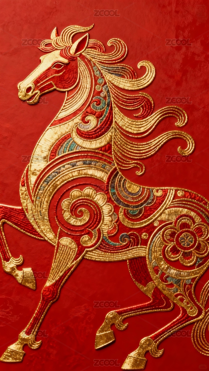 中国传统生肖马敦煌纹样红金配色金线刺绣