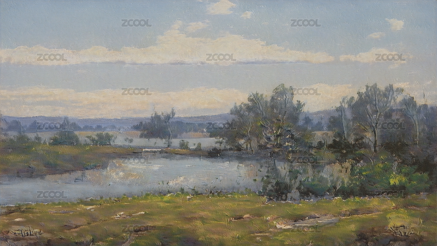 夏天湖边户外自然风景油画