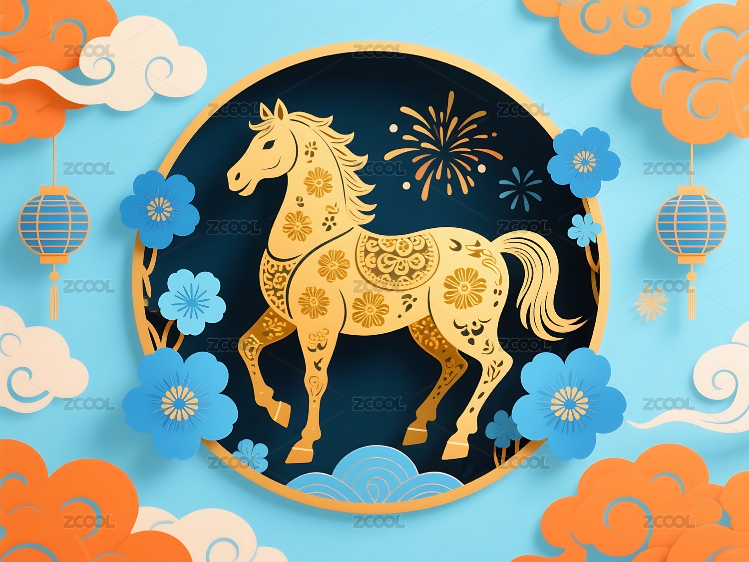 马,剪纸,2026,春节,云朵,金色,彩虹,艺术,生肖,贺年