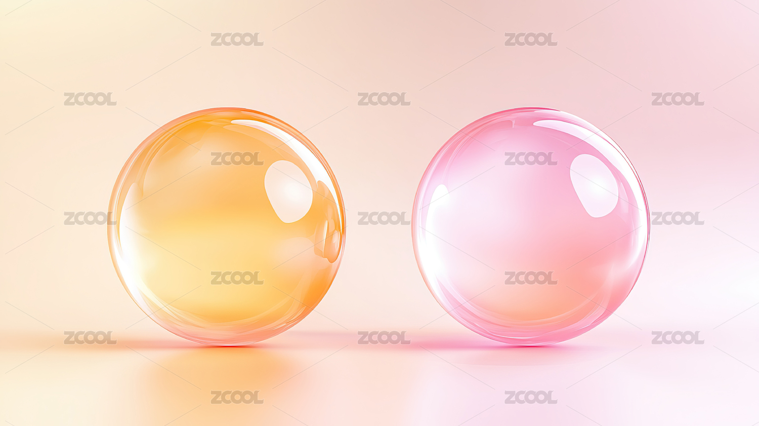两颗粉色透明气泡玻璃球静置于白色背景上