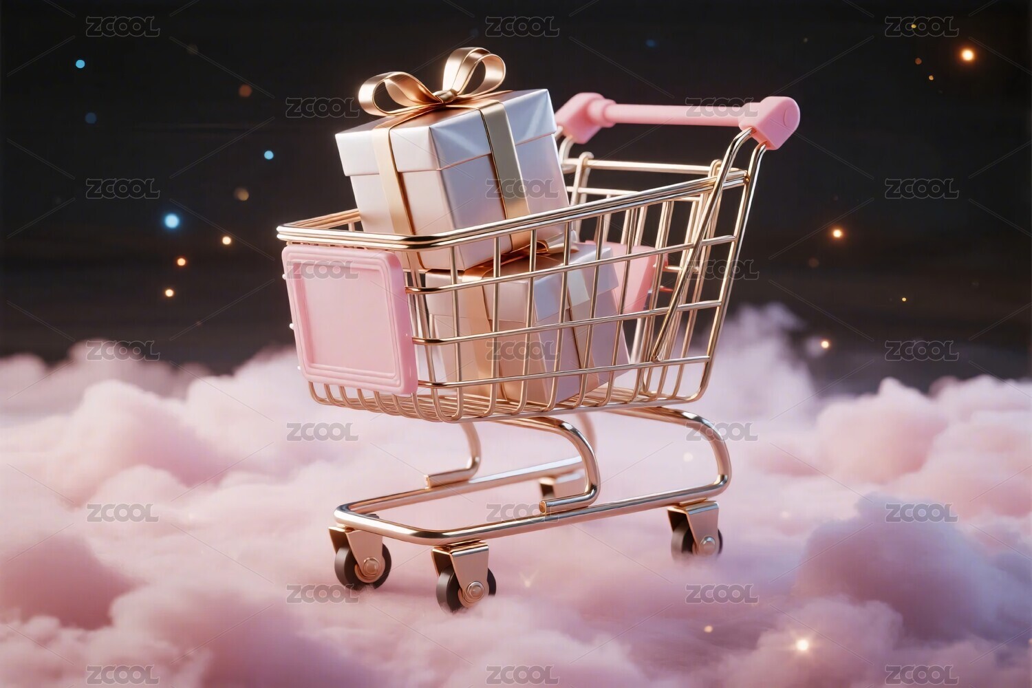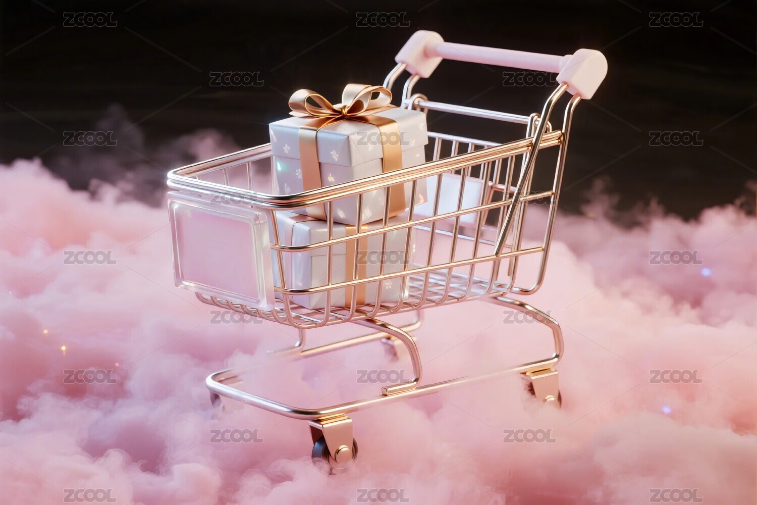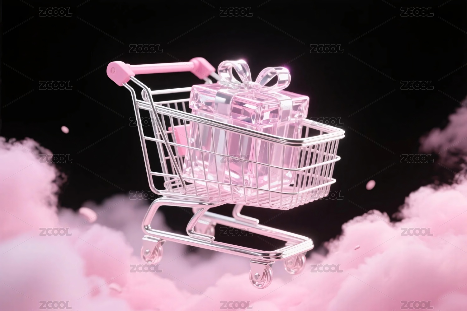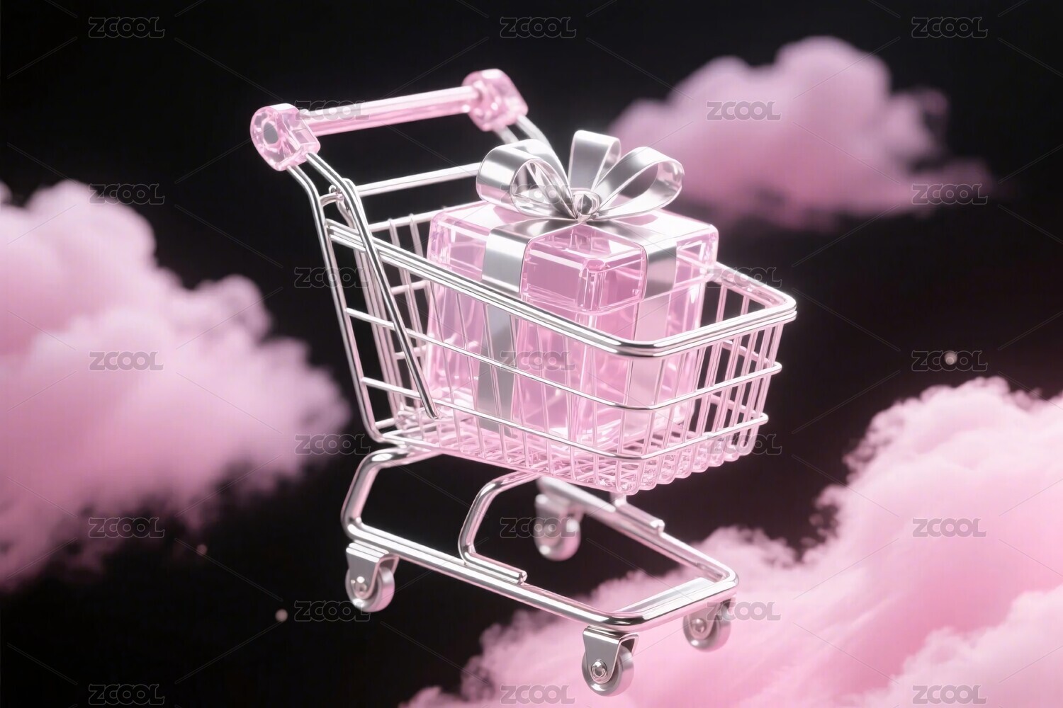购物车,礼物盒,粉色云,数字艺术,礼品,插画,粉色,云朵,飘带,购物