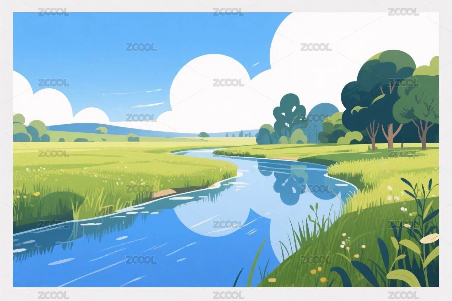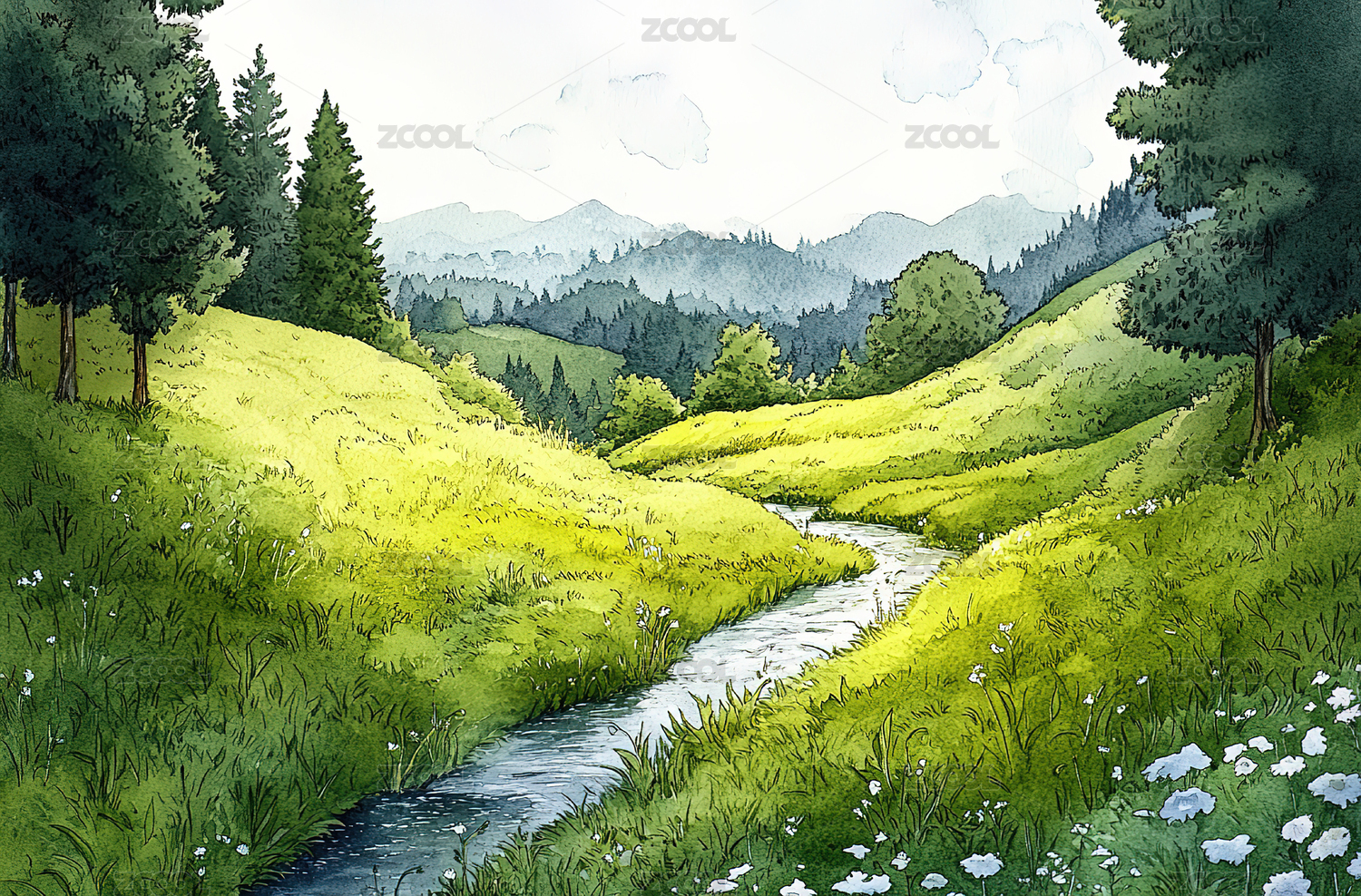 山水,河流,花草,青山,长卷,水彩,风景,自然,手绘,插画