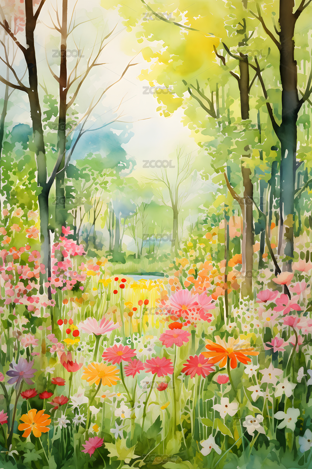 溪水,花草,树林,水彩,插画,风景,自然,绿色,花卉,河流