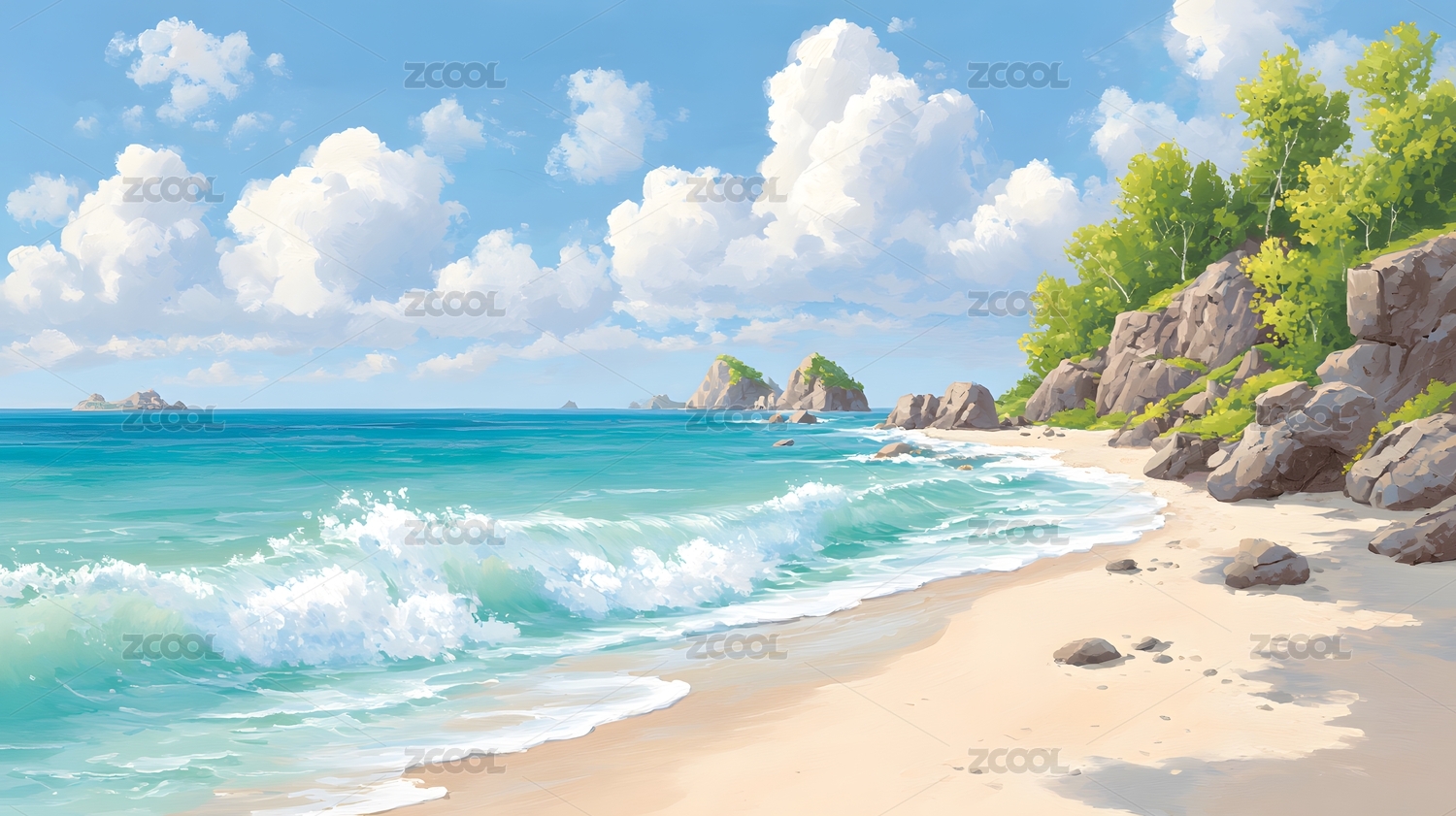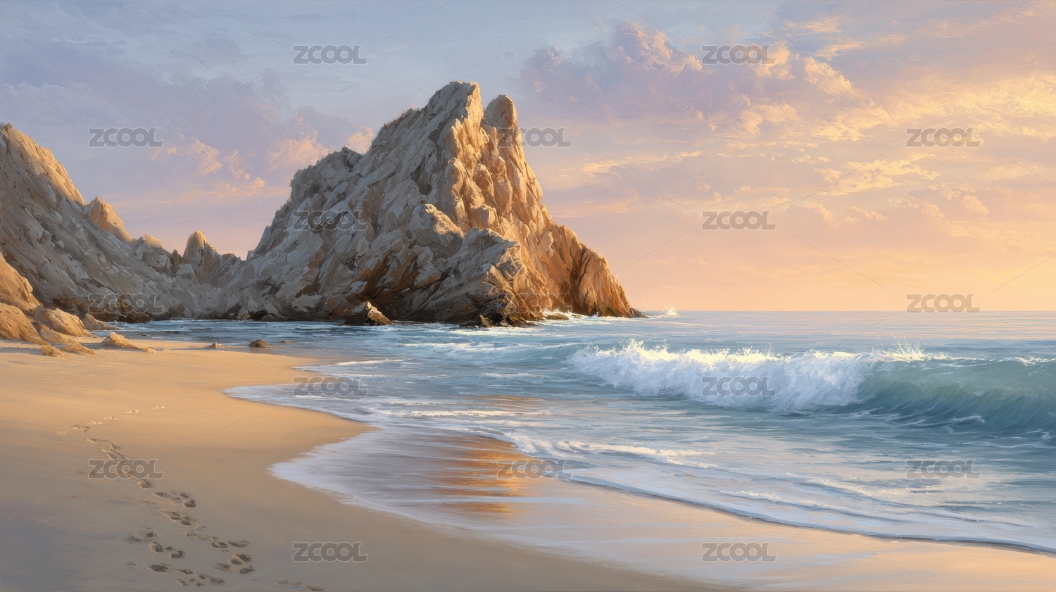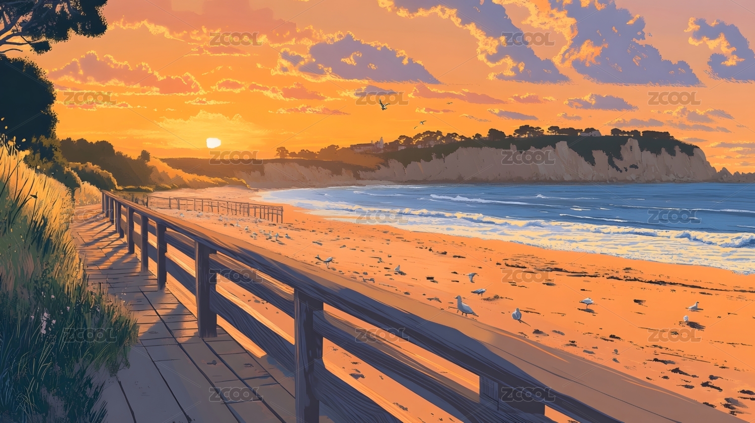 海滩,海洋,岩石,日落,沙滩,树木,风景,自然,插画,矢量