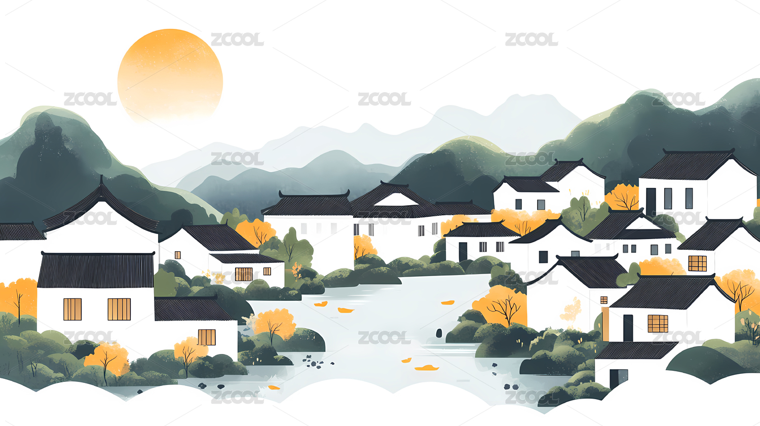 山水,村庄,民居,古建筑,远山,绿树,水墨风,自然,景观