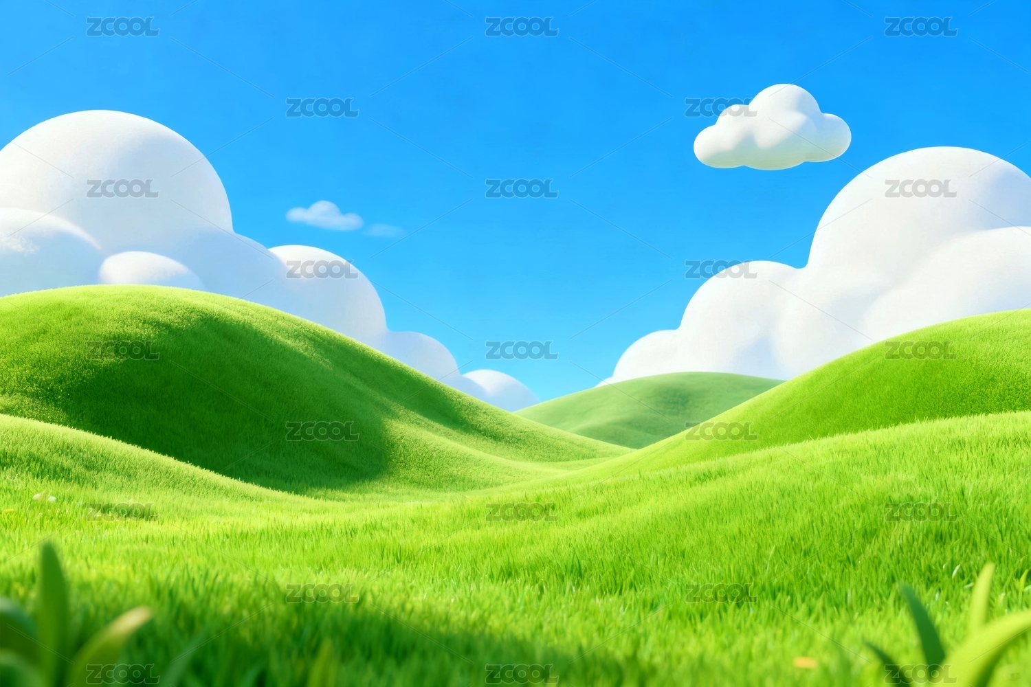 3d渲染卡通蓝天白云绿草地