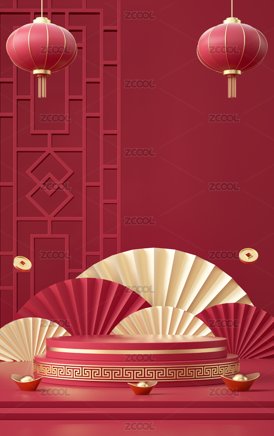 红色,国风,展示,场景,折扇,灯笼,祥云,喜庆,传统,春节