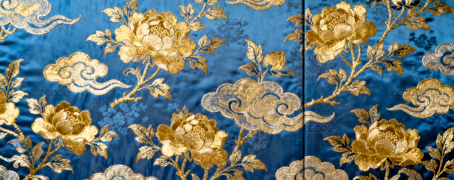 国风传统文化刺绣蓝色白色牡丹图案插画背景