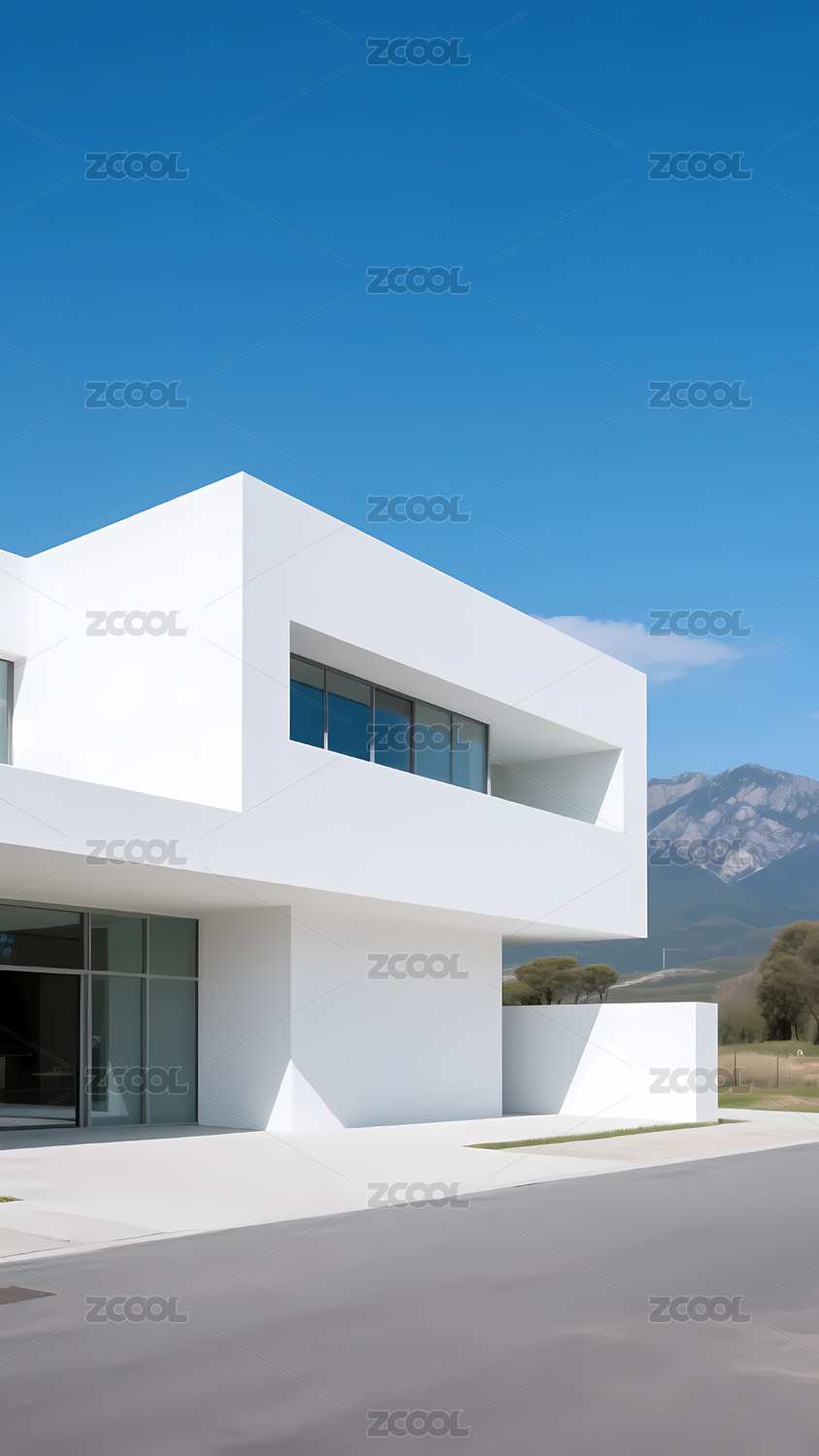 极简现代建筑,白色外墙,树木前