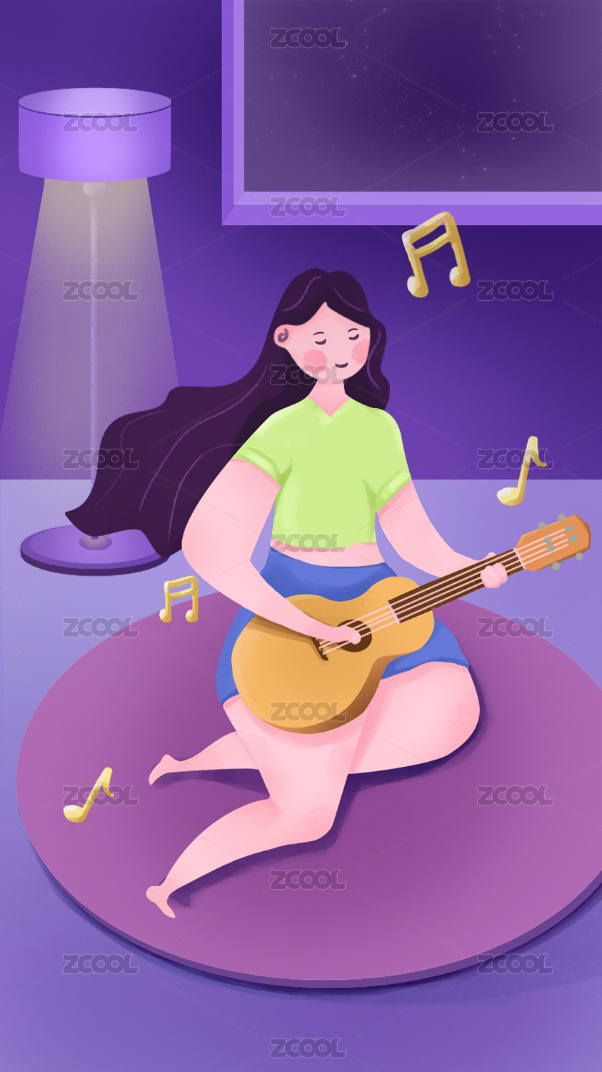 白色,蓝色,黄色,女孩,衣服,粉色,长发,卡通,吉他,坐着