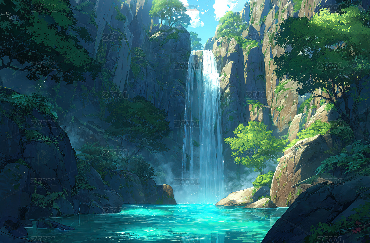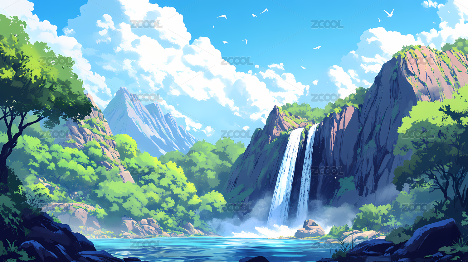 复古日漫夏季瀑布风景旅游旅行游玩景色